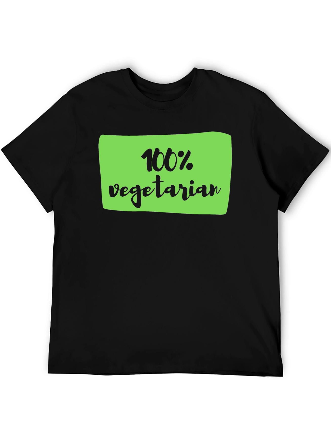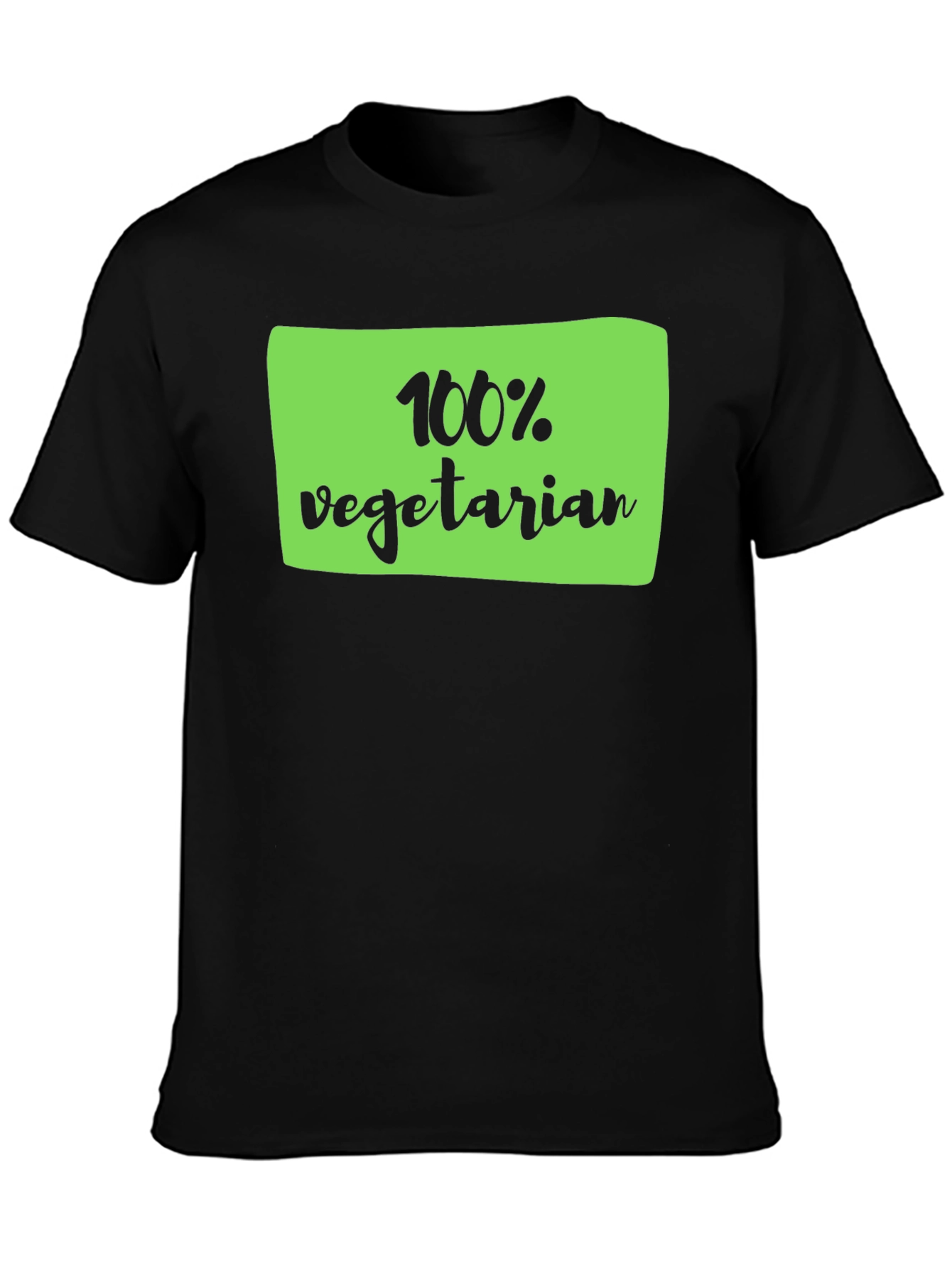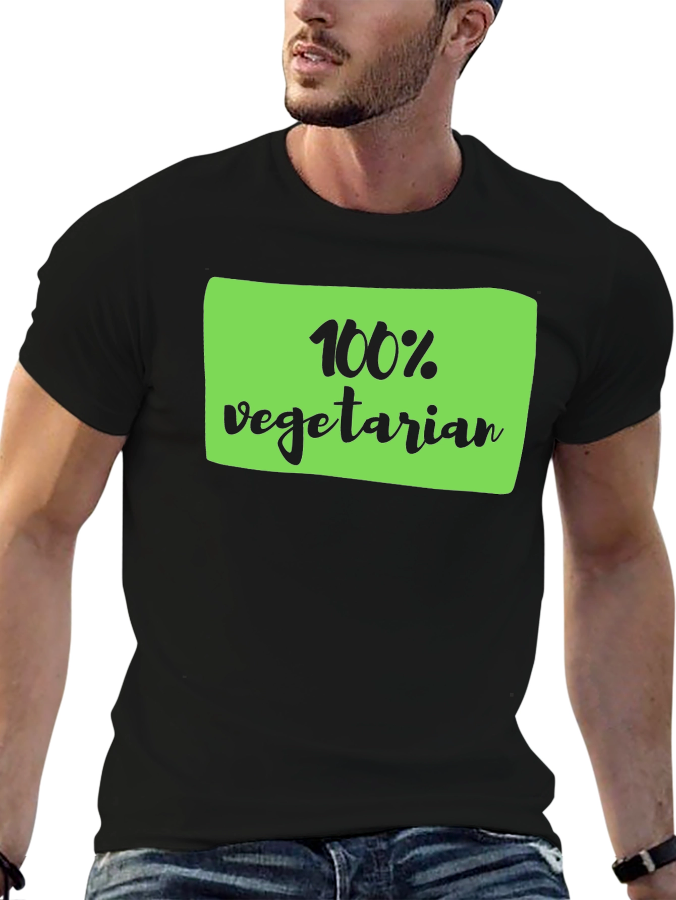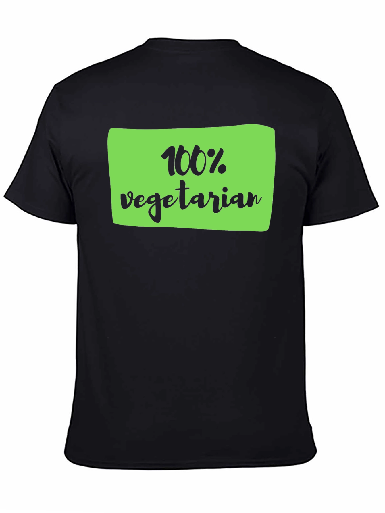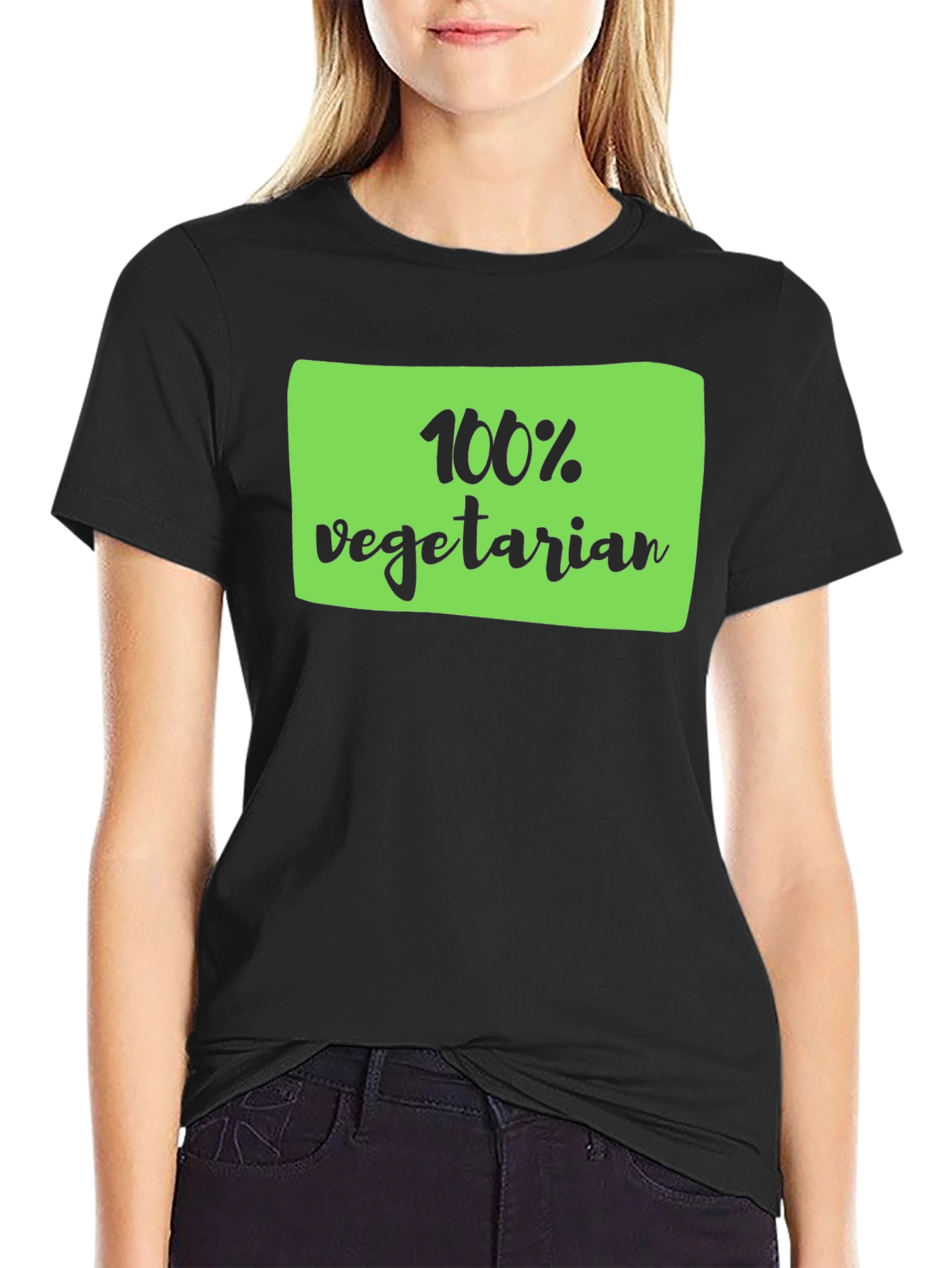 Show off your lifestyle with this stylish black t-shirt! The shirt features a bright green box with the phrase '100% vegetarian' printed in a black, handwritten-style font. Made from a comfortable-looking material, this tee is perfect for everyday wear. Its relaxed fit allows for easy movement and a casual feel. Great for spreading awareness and making a statement! Wear it to the grocery store, farmers market, or your next vegetarian potluck. A must-have for any vegetarian's wardrobe.