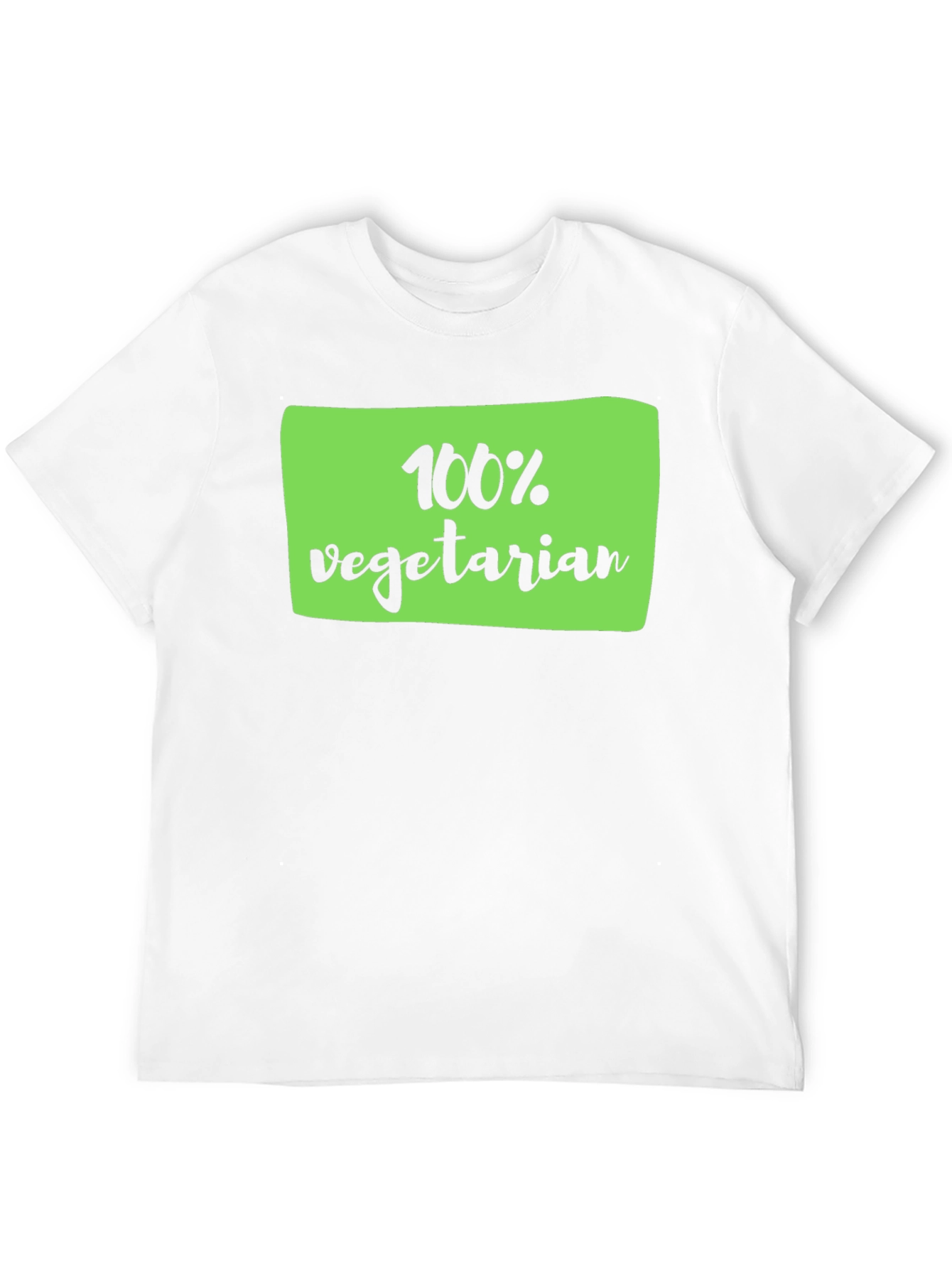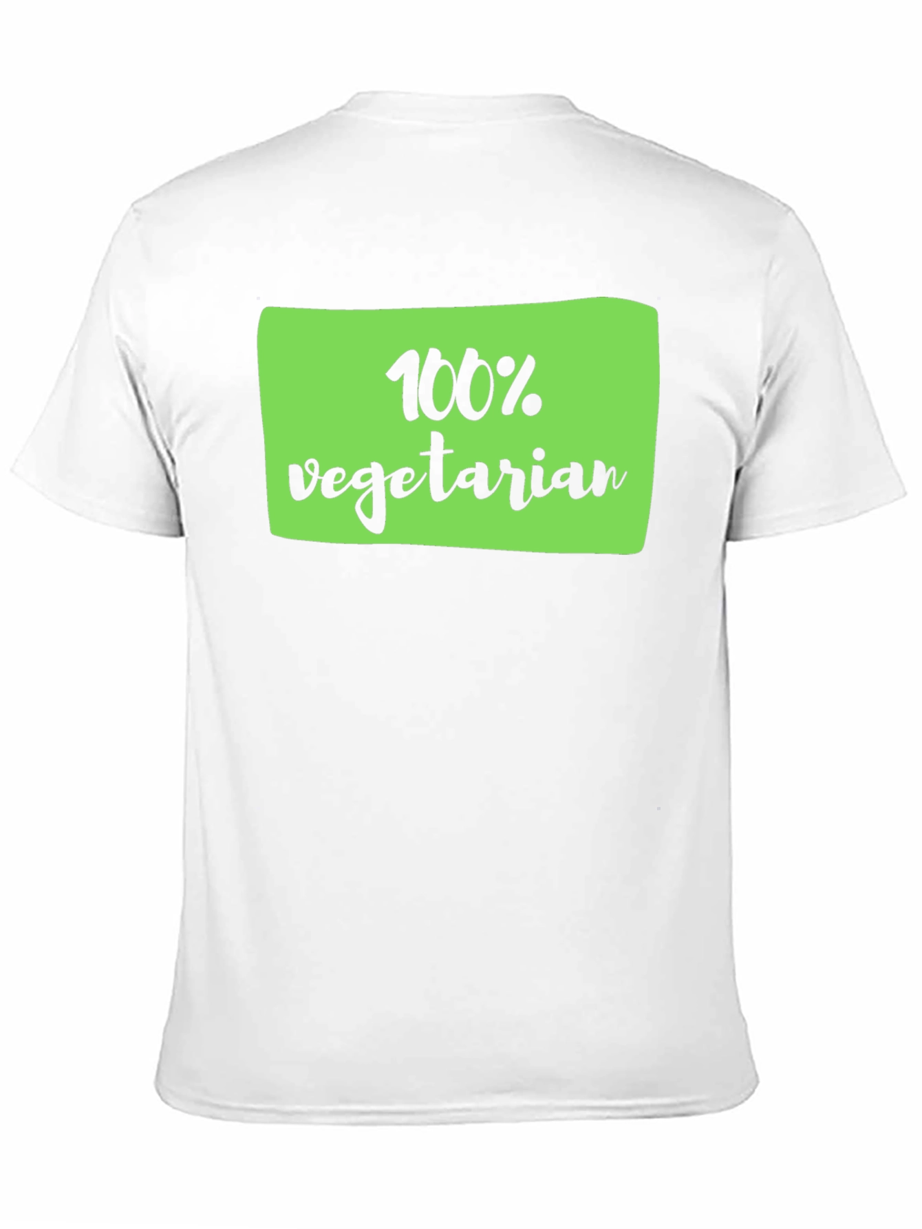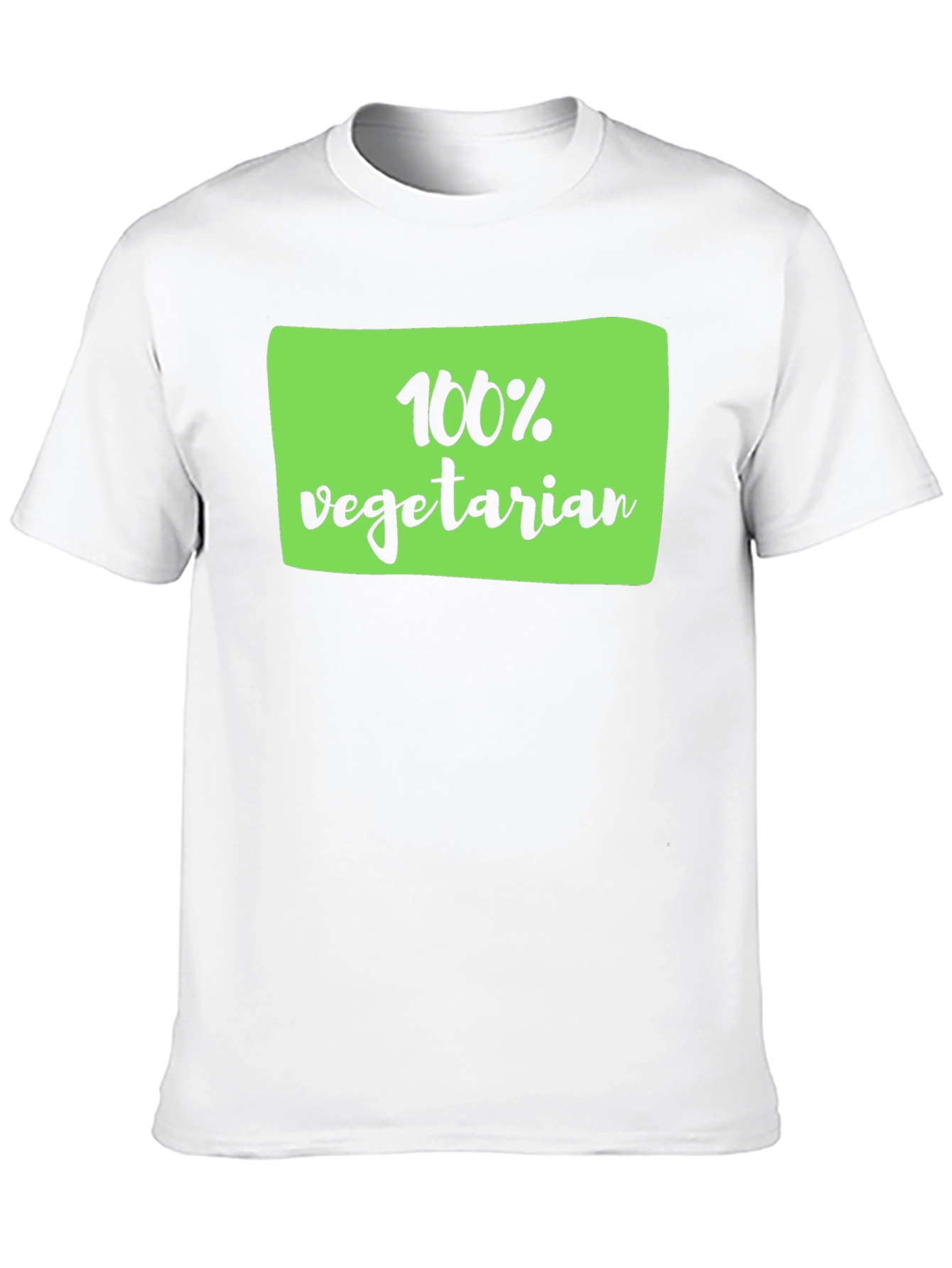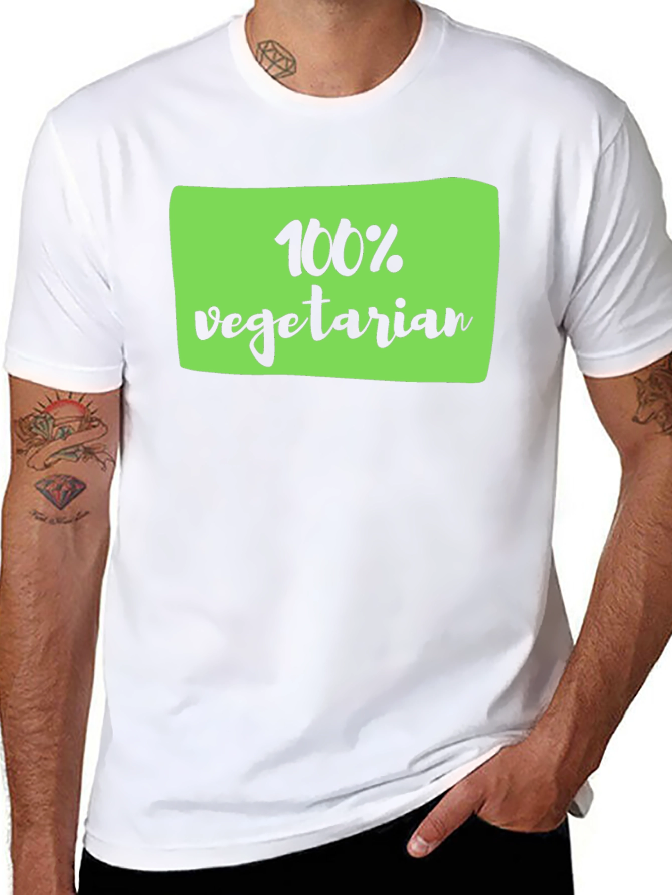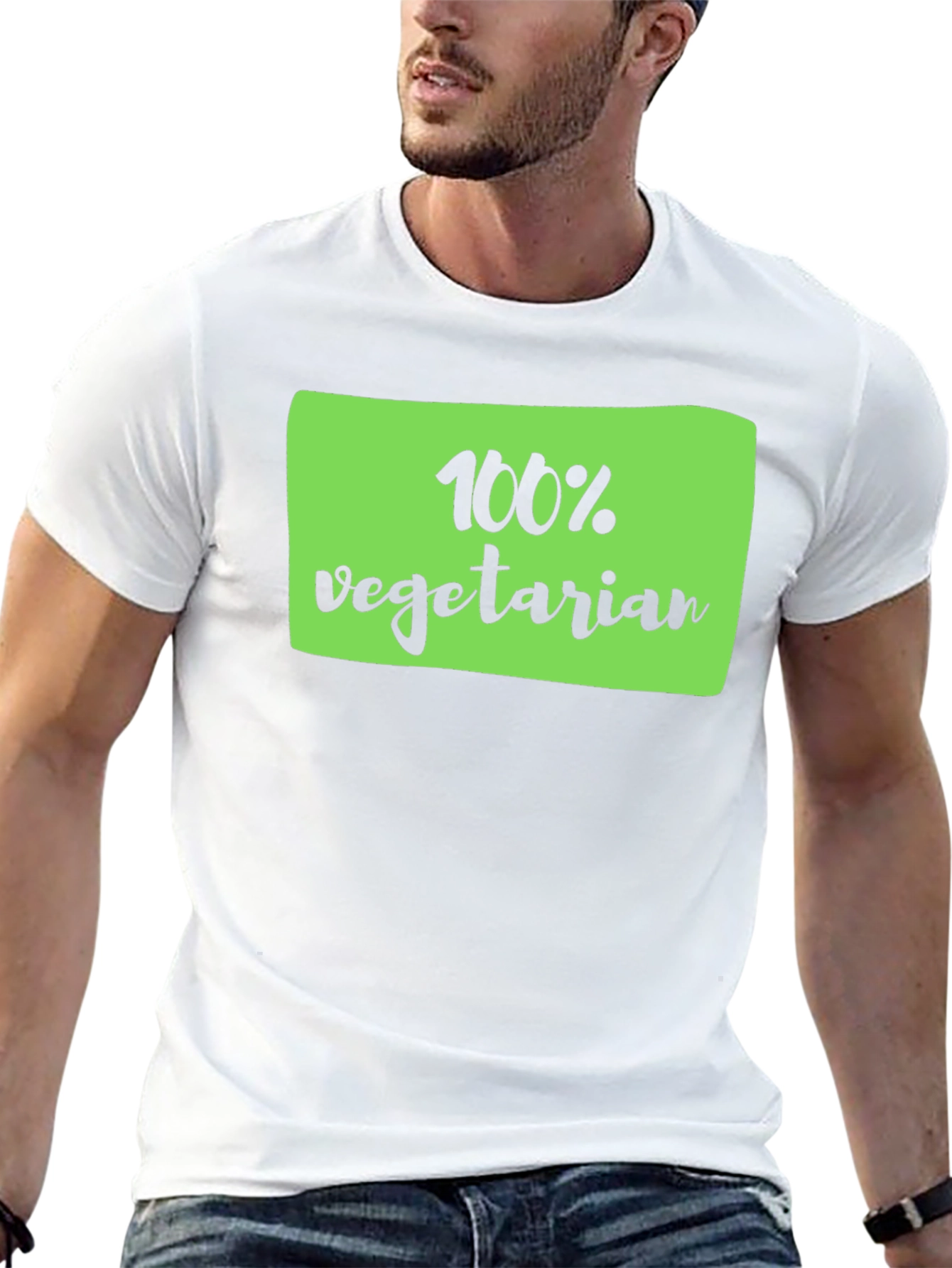 Show off your lifestyle with this stylish black t-shirt! The shirt features a bright green box with the phrase '100% vegetarian' printed in a black, handwritten-style font. Made from a comfortable-looking material, this tee is perfect for everyday wear. Its relaxed fit allows for easy movement and a casual feel. Great for spreading awareness and making a statement! Wear it to the grocery store, farmers market, or your next vegetarian potluck. A must-have for any vegetarian's wardrobe.