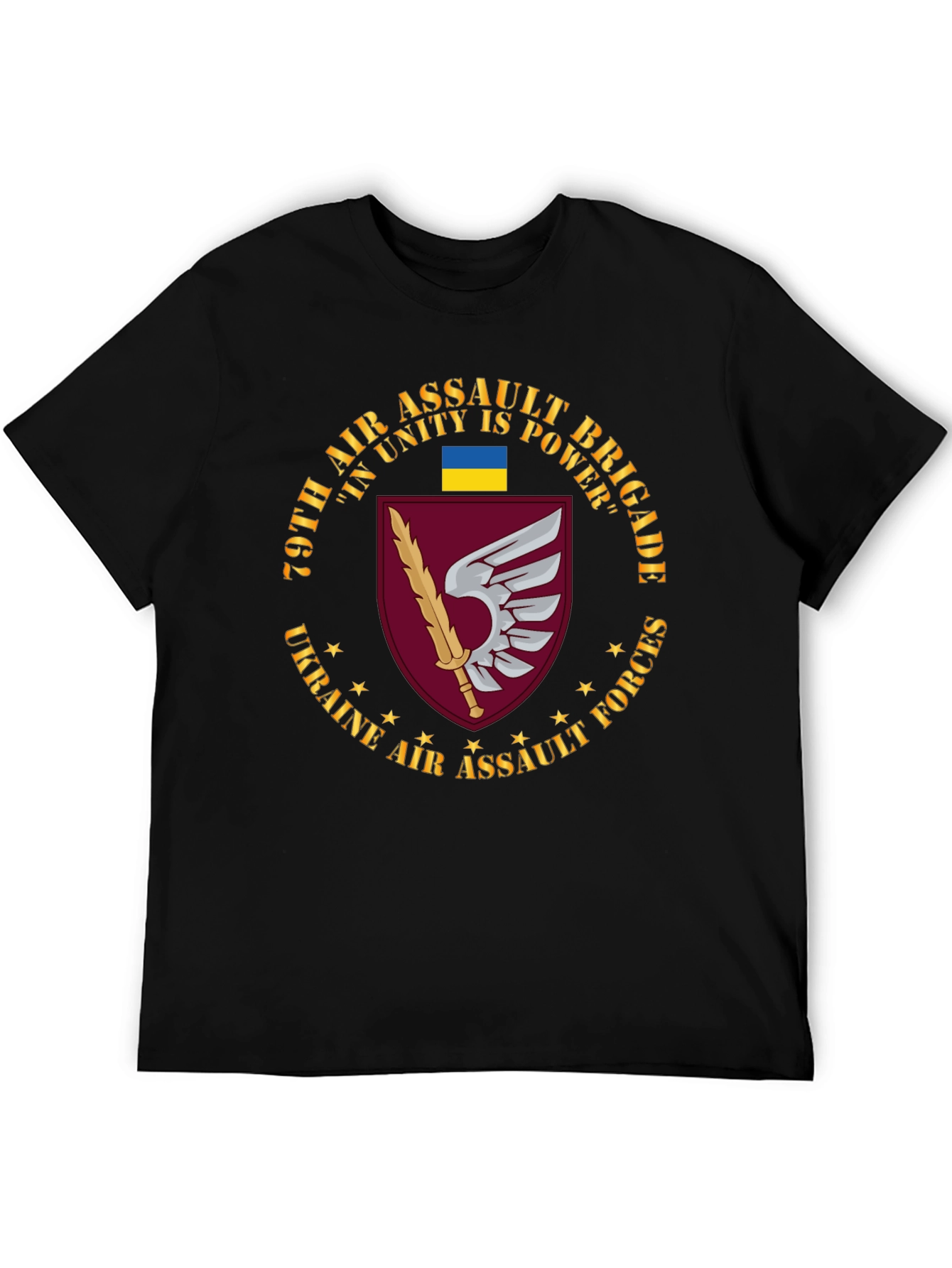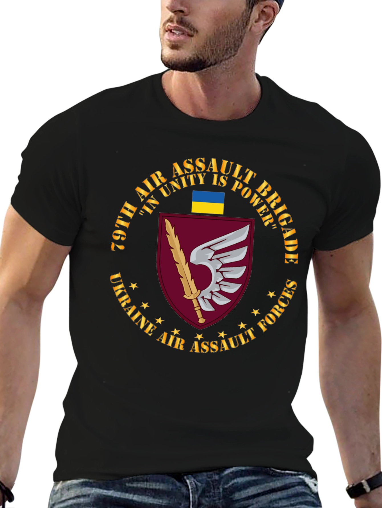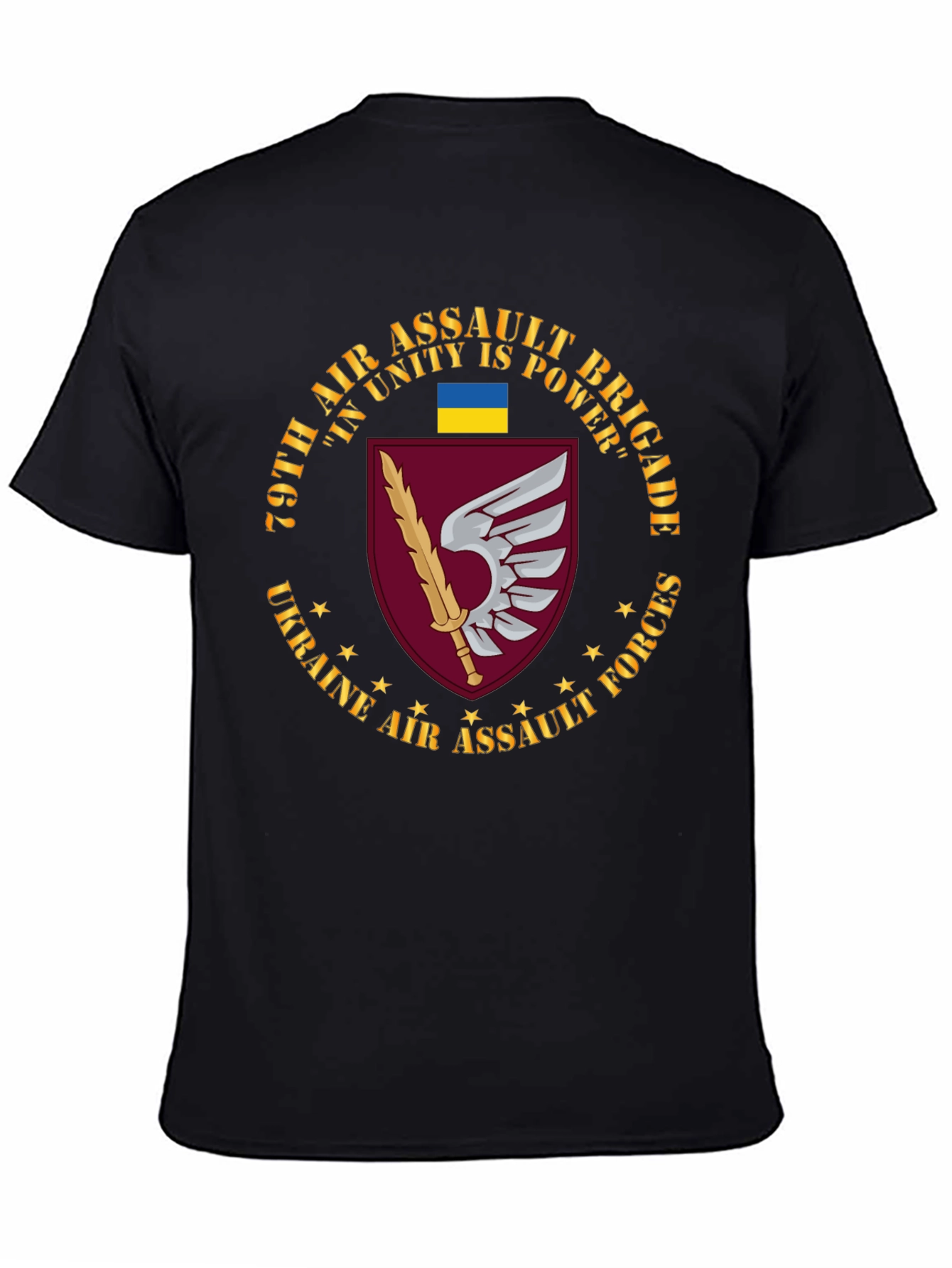 Show your support with this striking black t-shirt featuring the emblem of the 79th Air Assault Brigade of the Ukraine Air Assault Forces. The design showcases a prominent shield with a sword and wing motif, surrounded by the unit's name and motto "In Unity Is Power". The Ukraine flag colors are displayed above the shield. Made from a comfortable-looking fabric, this shirt is perfect for casual wear, demonstrating solidarity, or as a unique addition to any military enthusiast's wardrobe. Wear it with pride and stand with Ukraine!
