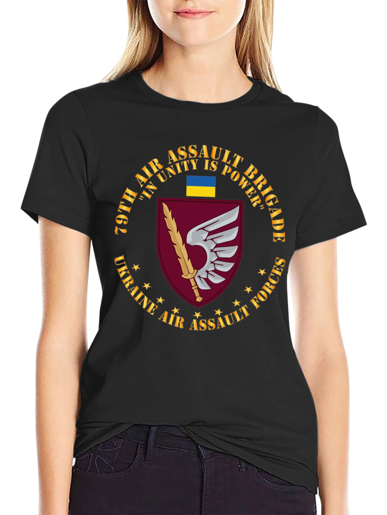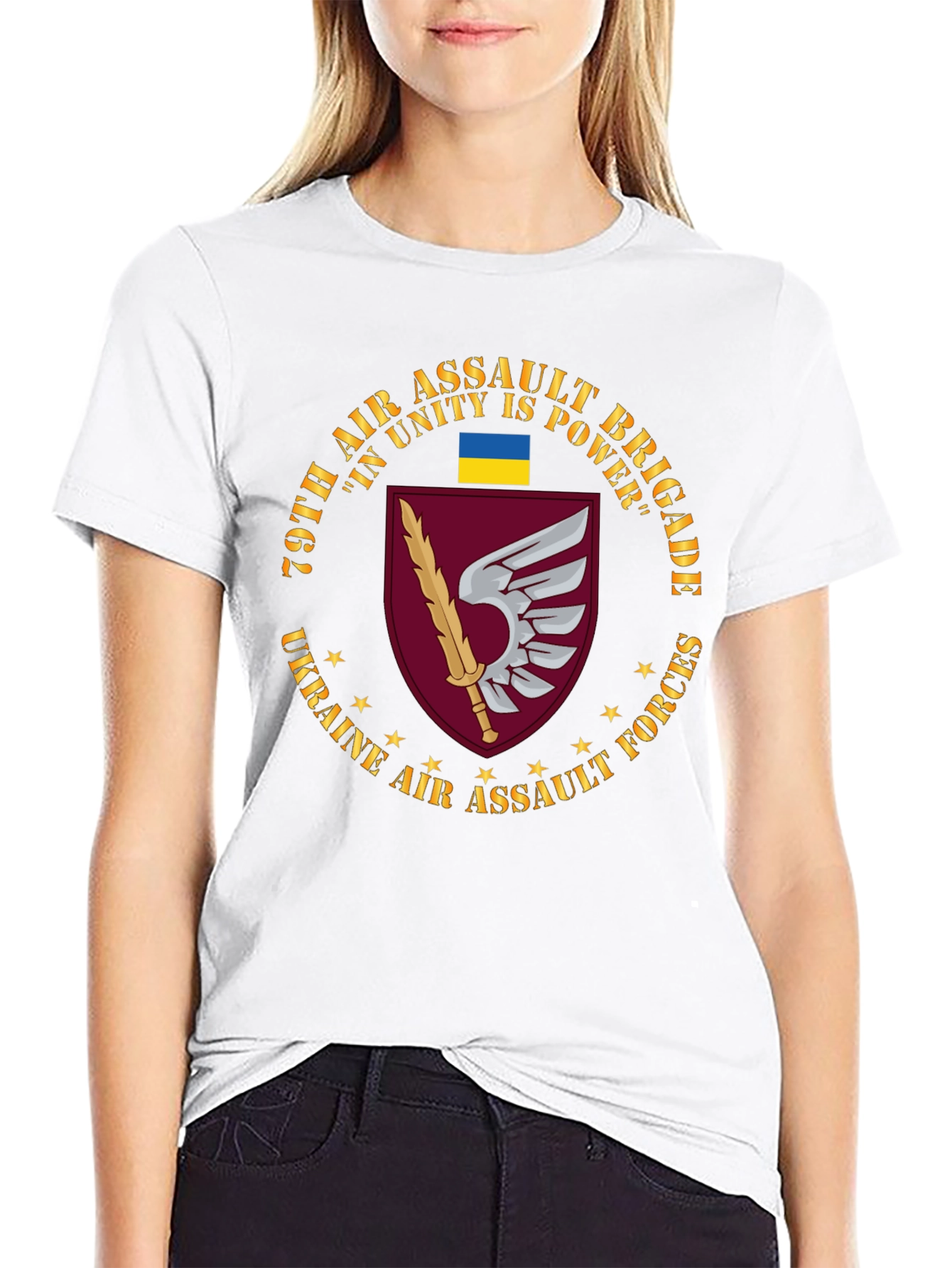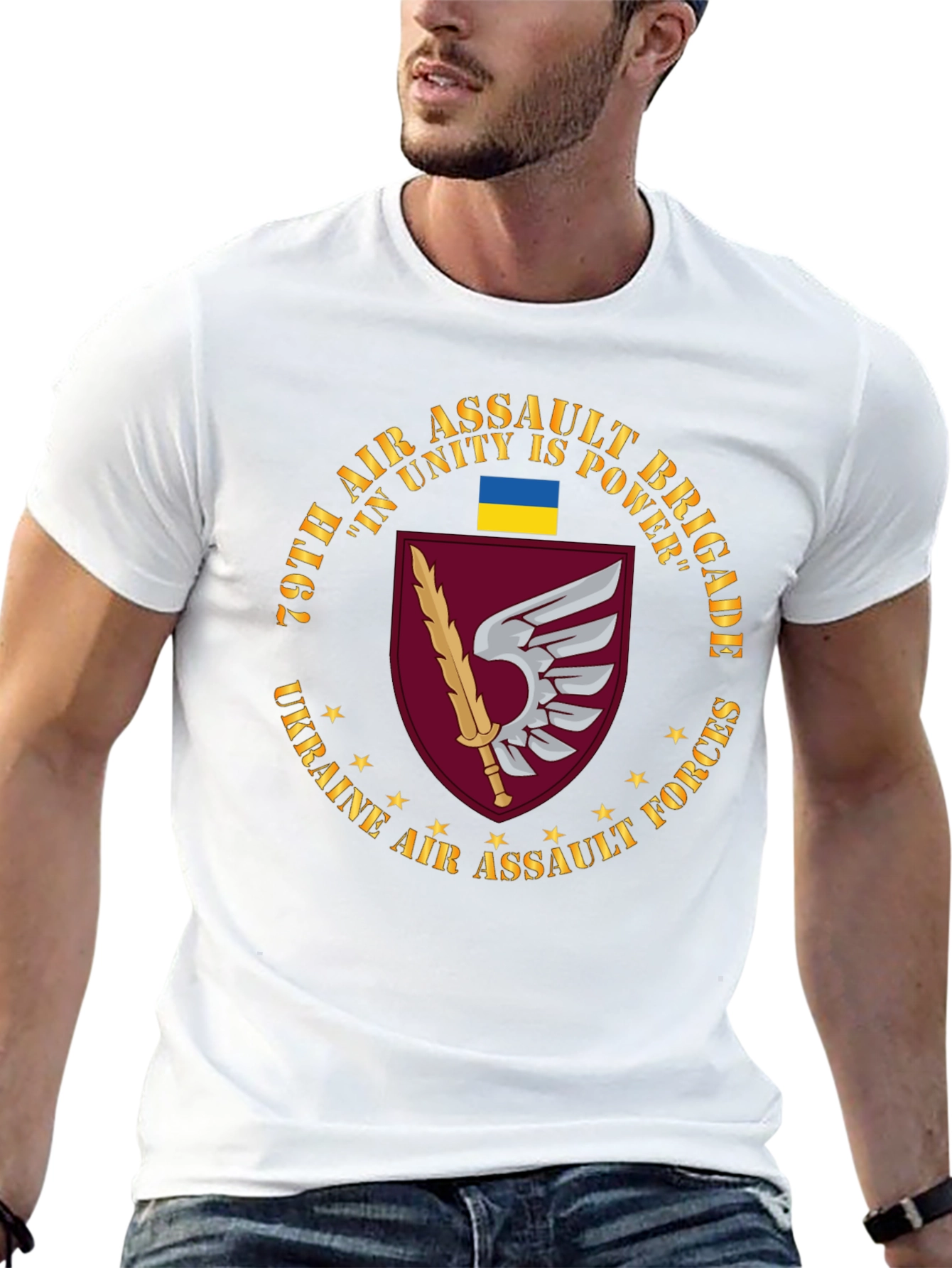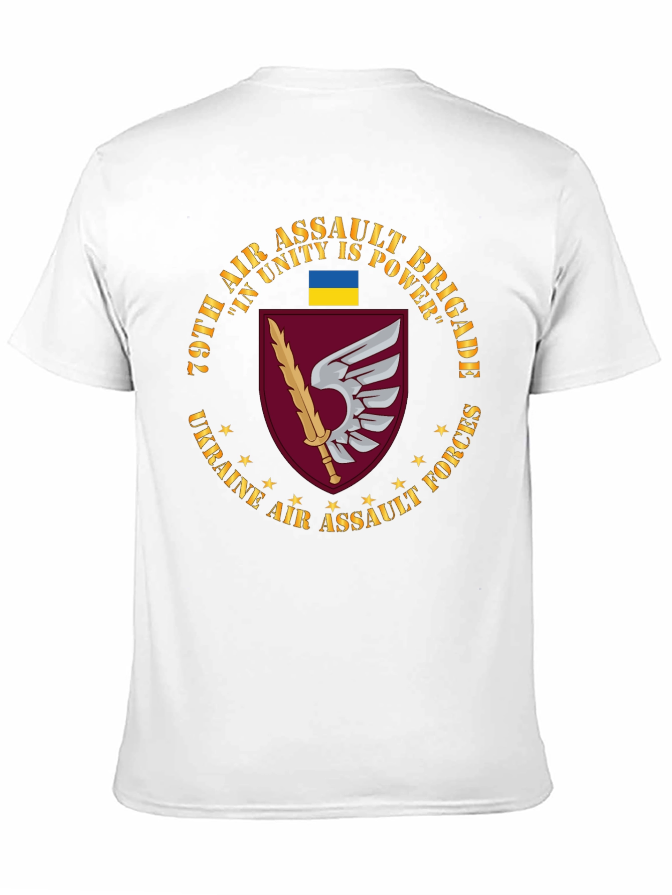 Show your support with this striking black t-shirt featuring the emblem of the 79th Air Assault Brigade of the Ukraine Air Assault Forces. The design showcases a prominent shield with a sword and wing motif, surrounded by the unit's name and motto "In Unity Is Power". The Ukraine flag colors are displayed above the shield. Made from a comfortable-looking fabric, this shirt is perfect for casual wear, demonstrating solidarity, or as a unique addition to any military enthusiast's wardrobe. Wear it with pride and stand with Ukraine!