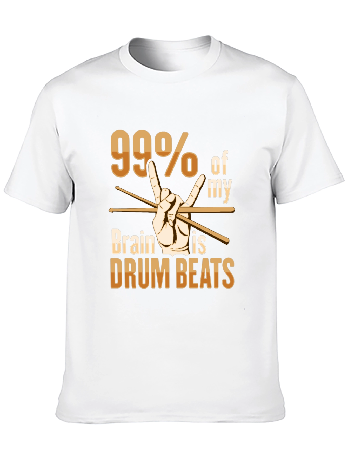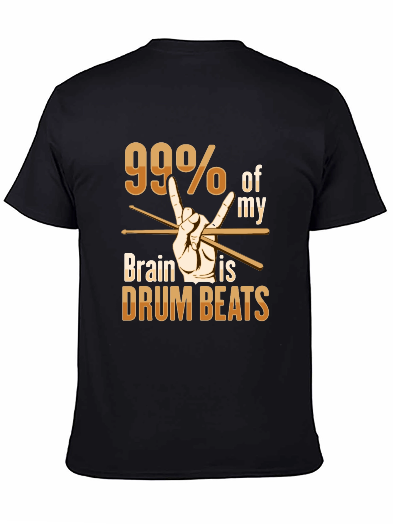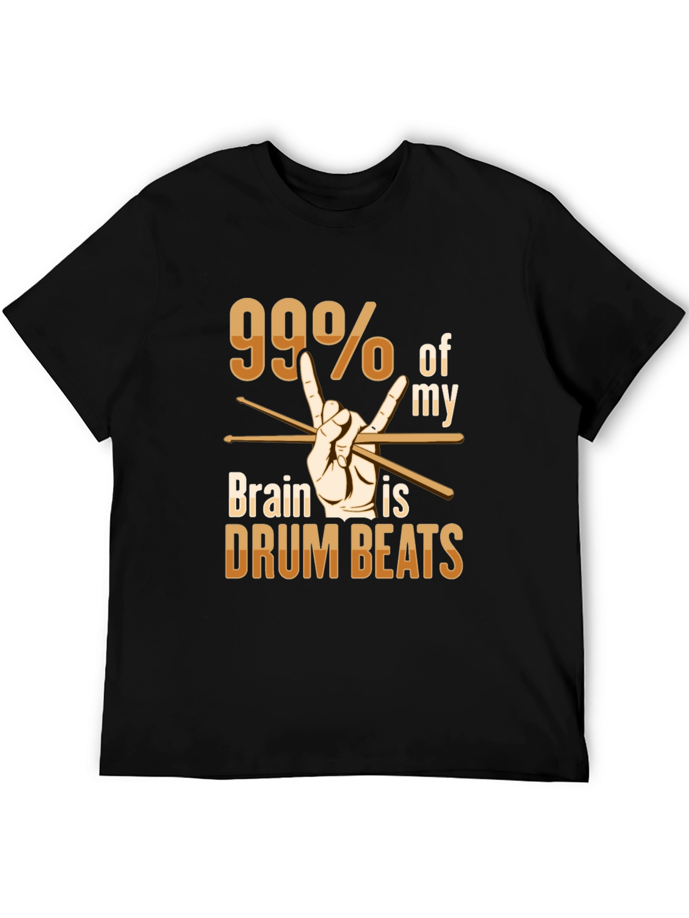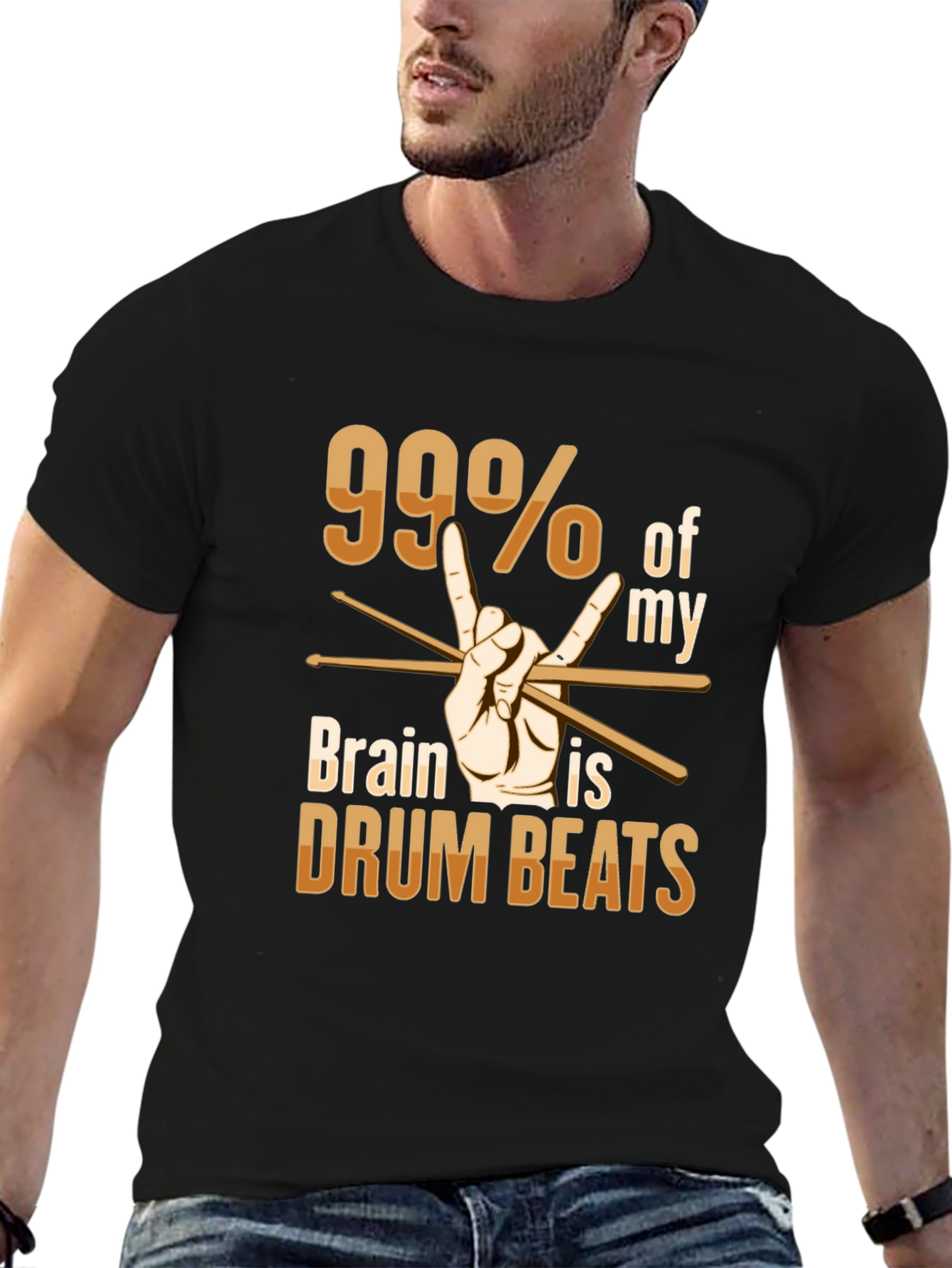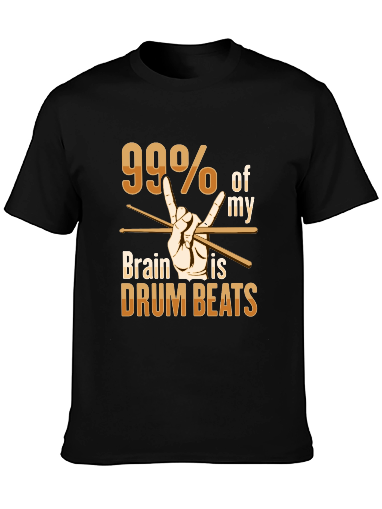 Show off your passion for drumming with this eye-catching black t-shirt! This fun shirt features a bold graphic design that declares "99% of my Brain is DRUM BEATS", complete with a hand making the rock on sign and drumsticks. Perfect for drummers, musicians, and music lovers, this tee is a great way to express your love for rock and roll. Comfortable and stylish, this shirt is ideal for everyday wear, band practice, concerts, or casual outings. Grab yours today and let the world know what's always on your mind!