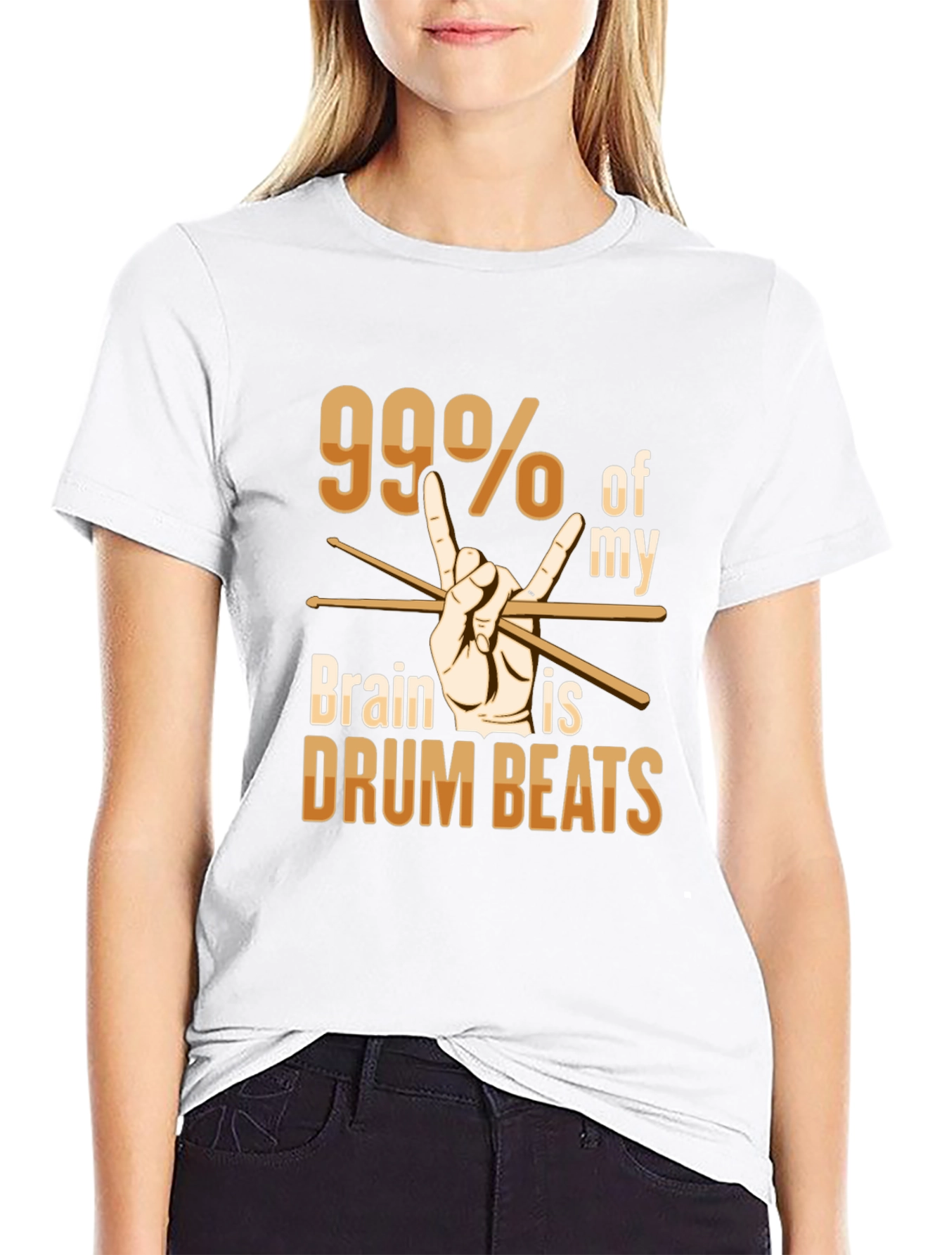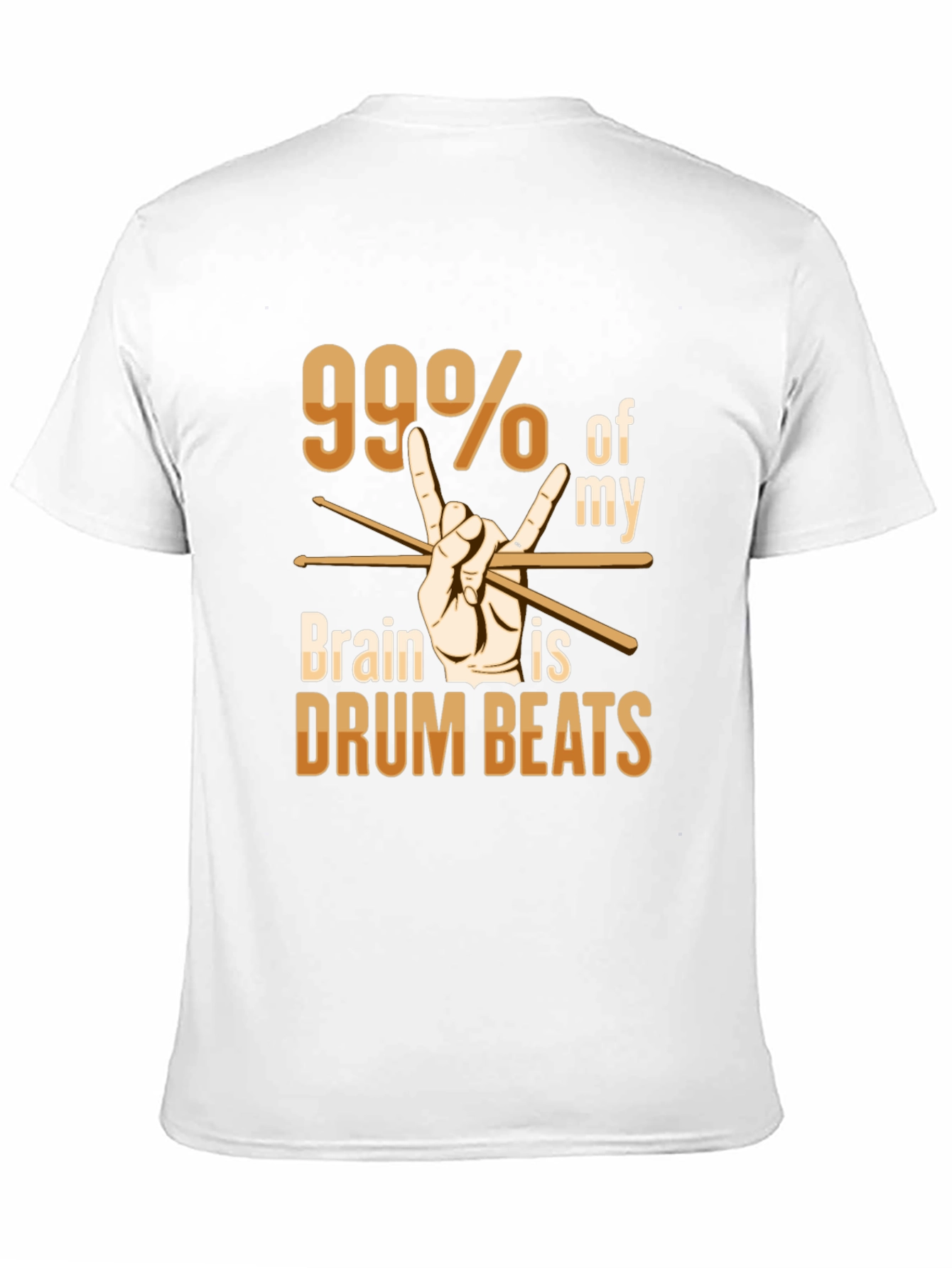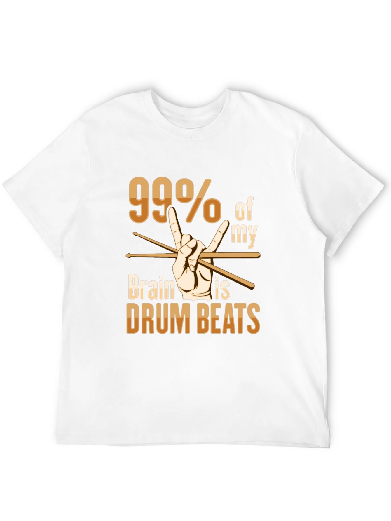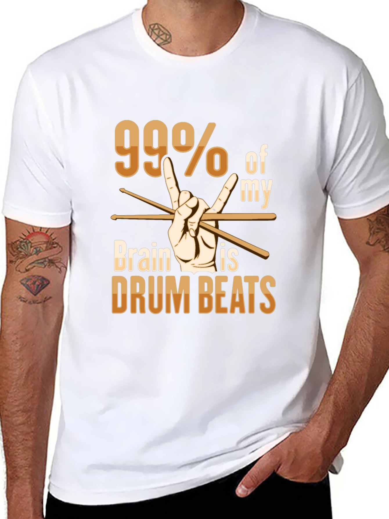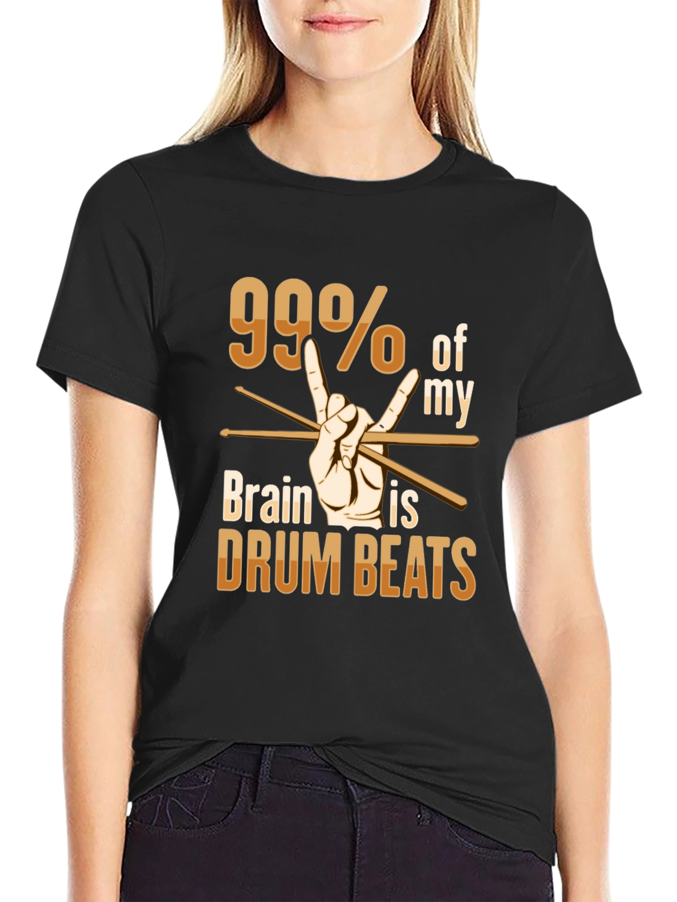 Show off your passion for drumming with this eye-catching black t-shirt! This fun shirt features a bold graphic design that declares "99% of my Brain is DRUM BEATS", complete with a hand making the rock on sign and drumsticks. Perfect for drummers, musicians, and music lovers, this tee is a great way to express your love for rock and roll. Comfortable and stylish, this shirt is ideal for everyday wear, band practice, concerts, or casual outings. Grab yours today and let the world know what's always on your mind!