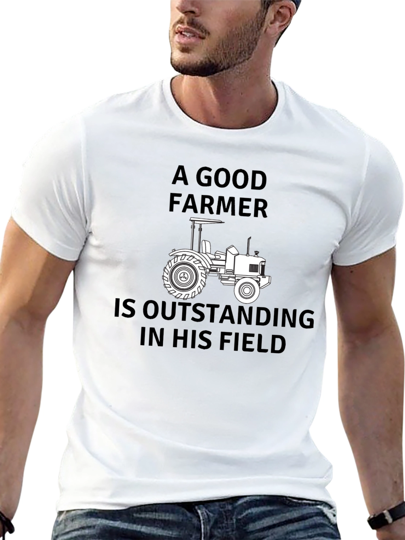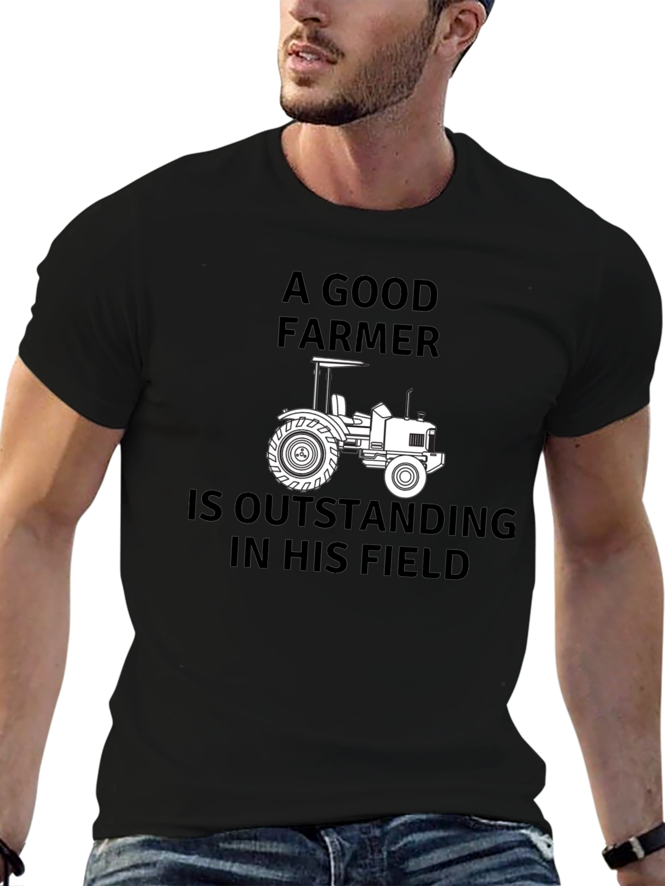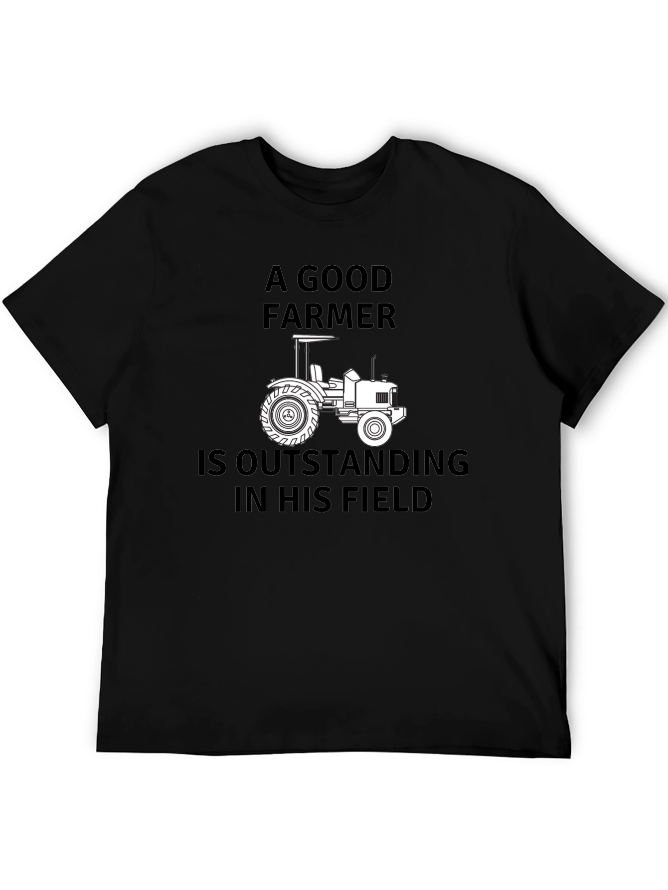Show off your farming pride with this classic black tee! Featuring a clean design with the witty slogan "A Good Farmer is Outstanding in His Field" accompanied by an illustrated tractor, this shirt is perfect for farmers and agriculture enthusiasts. Made from what appears to be a soft cotton blend, it offers a comfortable fit for everyday wear. Whether you're working on the farm, running errands, or just relaxing at home, this unique t-shirt is sure to make a statement and spark conversations. Get yours today and let everyone know you're a proud and outstanding farmer!