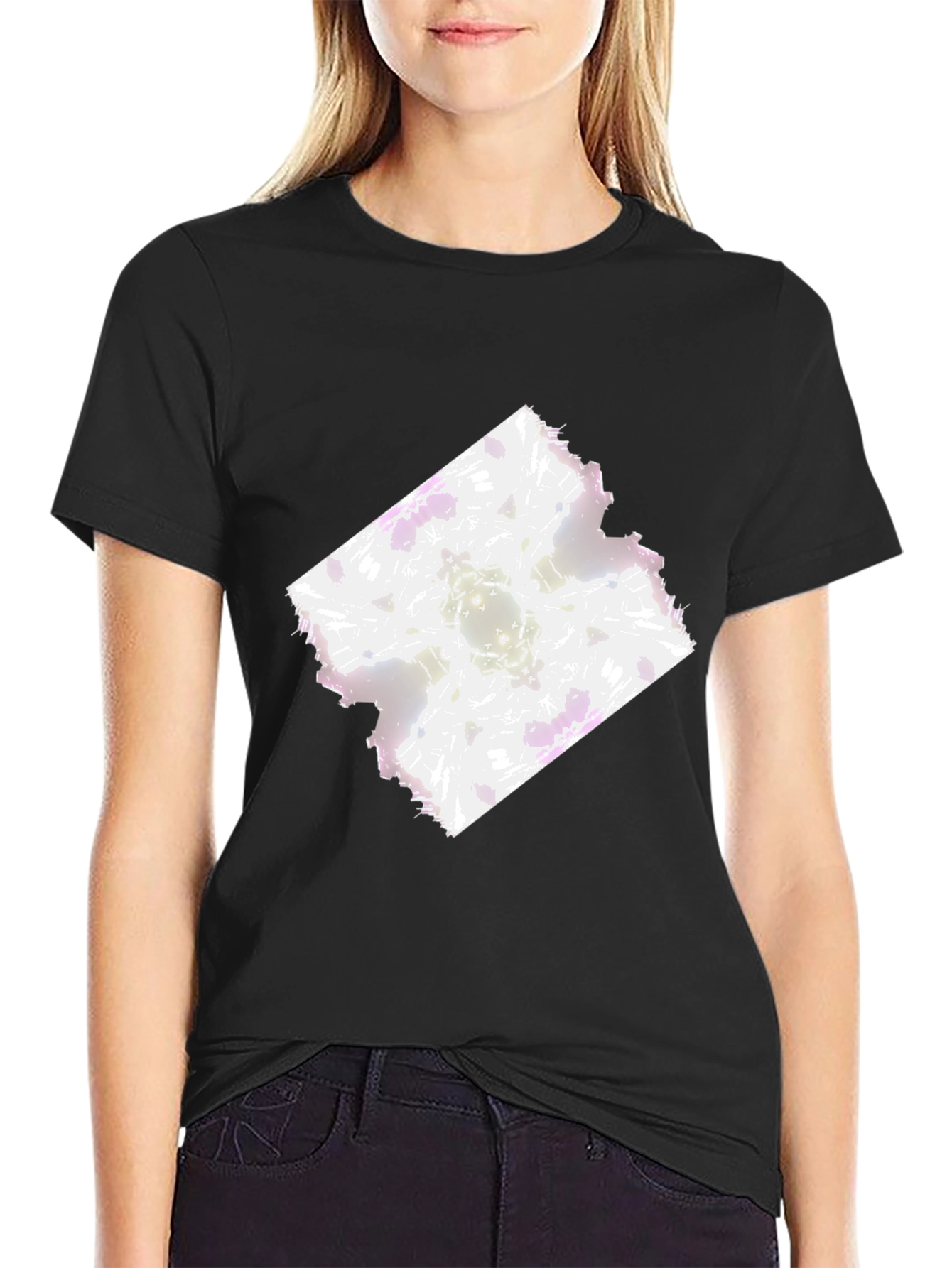 Elevate your casual style with this striking black t-shirt featuring an eye-catching abstract design. The unique graphic, a blend of white and pastel hues, is centered on the chest, making a bold statement. Crafted from a comfortable, soft-to-the-touch fabric, this tee is perfect for everyday wear. Its classic fit and short sleeves make it a versatile addition to any wardrobe. Whether you're heading out for a casual hangout or simply relaxing at home, this abstract art tee effortlessly combines comfort and style. A modern must-have for those who appreciate artistic flair.