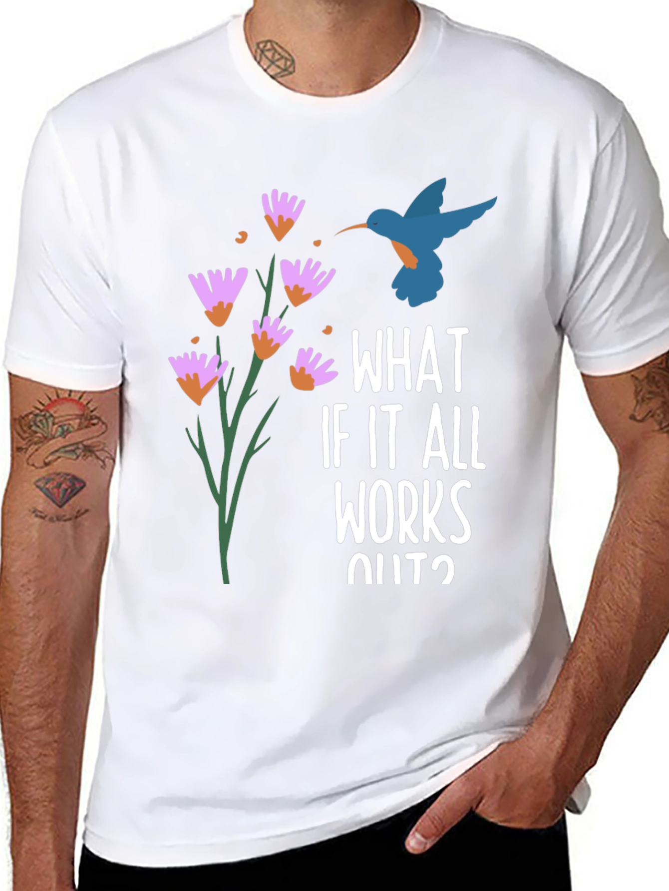 Embrace positivity with this stylish black graphic tee. Featuring a vibrant design with flowers and a hummingbird beside the saying, "What If It All Works Out?", this shirt is perfect for adding a touch of optimism to your everyday look. The casual fit and soft fabric ensure all-day comfort, making it ideal for relaxed outings, casual hangouts, or simply expressing your positive outlook. Made from comfortable materials, this tee is a must-have for anyone who loves unique designs with a positive message. Spread good vibes wherever you go with this eye-catching and inspiring t-shirt!
