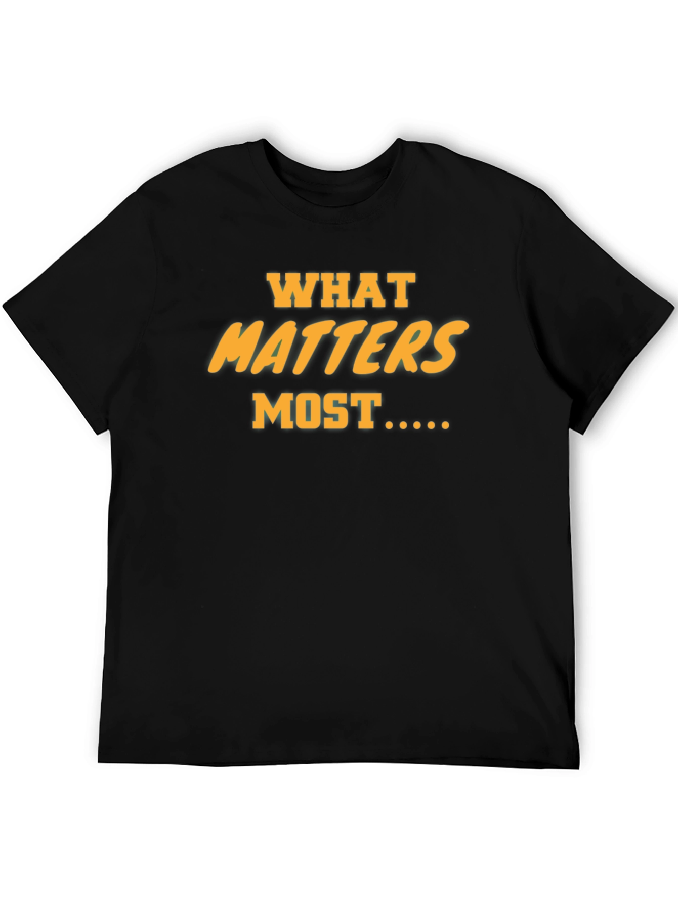 Show off your priorities with this bold graphic tee. Made from a soft, breathable fabric, this black t-shirt features a striking orange text design that reads "What Matters Most....." in a classic, eye-catching font. The comfortable fit and versatile style make it perfect for everyday wear, casual outings, or as a statement piece. Express yourself effortlessly with this unique and stylish tee. It is a great way to showcase your values and start conversations.