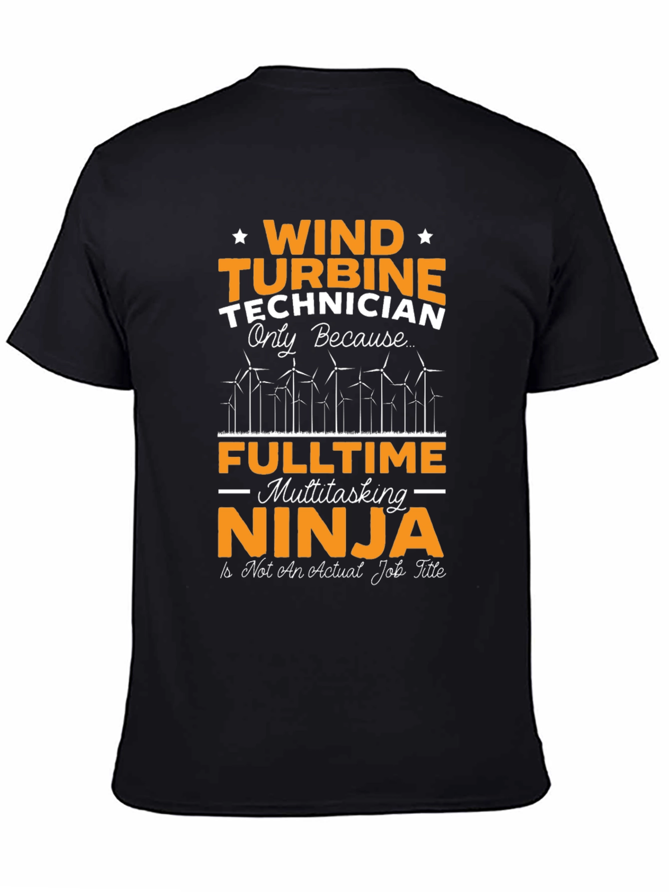 Showcase your unique profession with this bold, black t-shirt. The design features eye-catching orange and white lettering that proudly declares "Wind Turbine Technician" with the humorous addition of "Fulltime Multitasking Ninja". A graphic of wind turbines is subtly incorporated into the design. Made from a comfortable-looking fabric, this shirt is perfect for casual wear, work events, or as a conversation starter. It's a great way to express your passion for renewable energy and your sense of humor. Get yours today and let everyone know you're a real-life wind turbine superhero! Machine washable. A great gift for technicians.