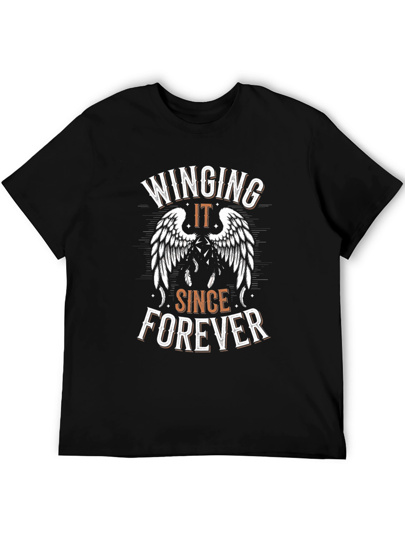 Showcase your care-free attitude with this stylish graphic tee. This black t-shirt features a bold "Winging It Since Forever" print, complete with detailed wing graphics. Crafted from soft, breathable fabric, this tee offers all-day comfort and a relaxed fit. Perfect for casual outings, weekend adventures, or simply lounging at home, it pairs effortlessly with jeans, shorts, or joggers. The unique design adds a touch of personality to any outfit. Express yourself with this distinctive and comfortable tee!