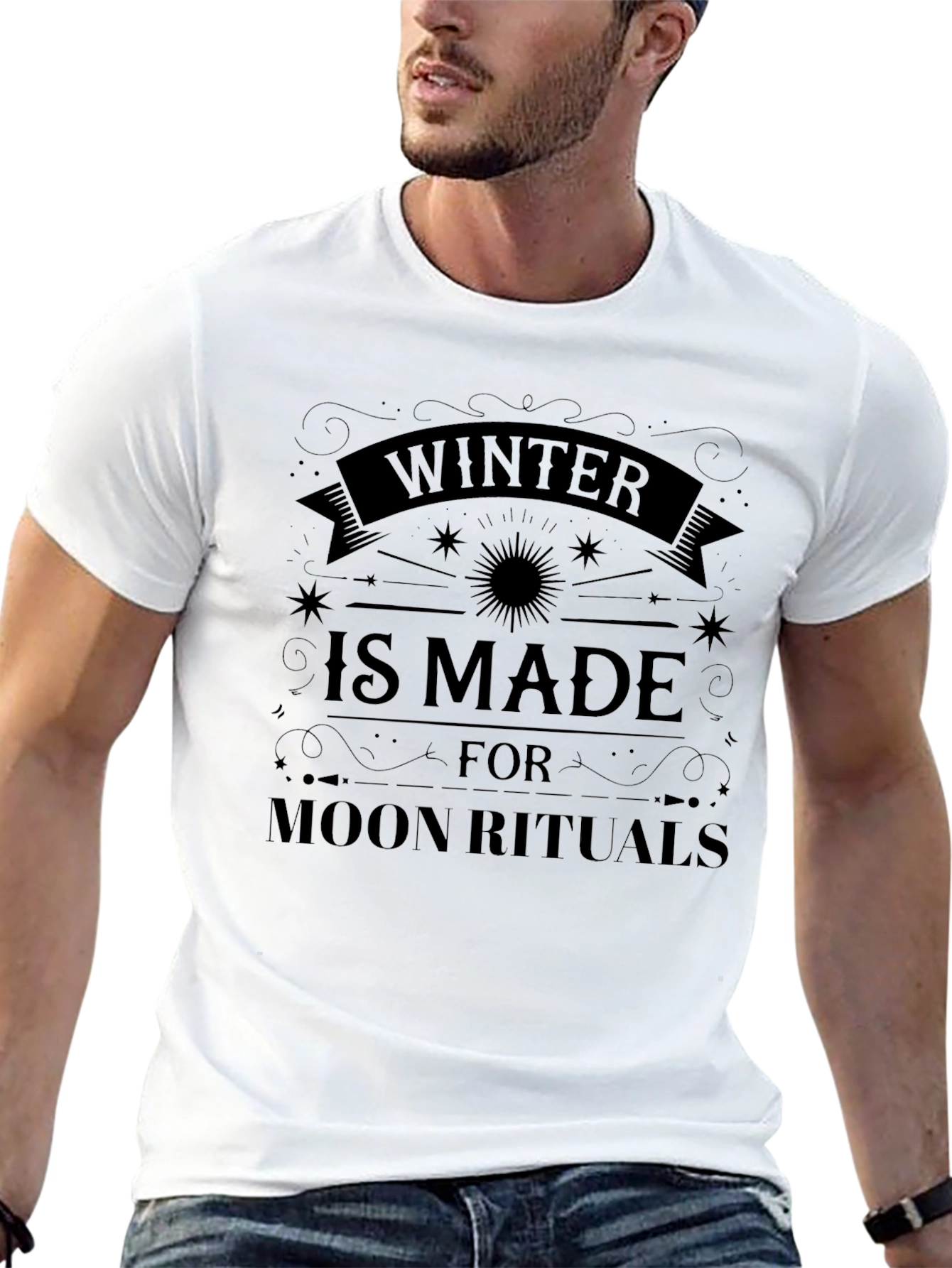 Embrace the mystical side of winter with this unique black graphic t-shirt. Featuring a bold design that reads "Winter is Made for Moon Rituals," this tee is perfect for those who appreciate celestial vibes and seasonal magic. The design includes artistic elements like stars, arrows, and a stylized sun, adding to its captivating appeal. Made from a comfortable and breathable fabric, this t-shirt is ideal for everyday wear. Its classic fit makes it a versatile addition to any wardrobe, easily paired with jeans, leggings, or skirts. Whether you're attending a winter solstice gathering, practicing your own rituals, or simply expressing your love for the season, this t-shirt is a stylish choice.