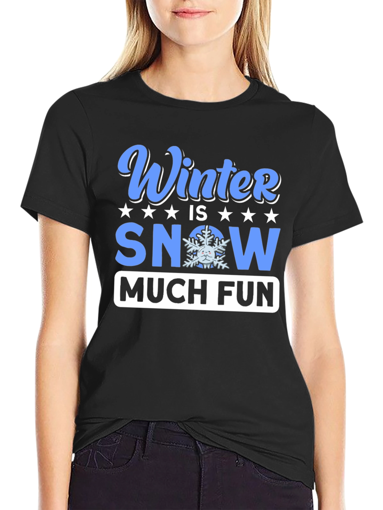 Embrace the winter spirit with this stylish black t-shirt. The playful design features the phrase "Winter is Snow Much Fun" in a cheerful blue font. Adorned with stars and a whimsical snowflake, this tee captures the joy of the season. Made from a comfortable material, it's perfect for casual wear, holiday gatherings, or cozy nights in. Show off your love for winter with this eye-catching shirt, a delightful addition to any wardrobe. It's not just a shirt; it's a statement of winter cheer.