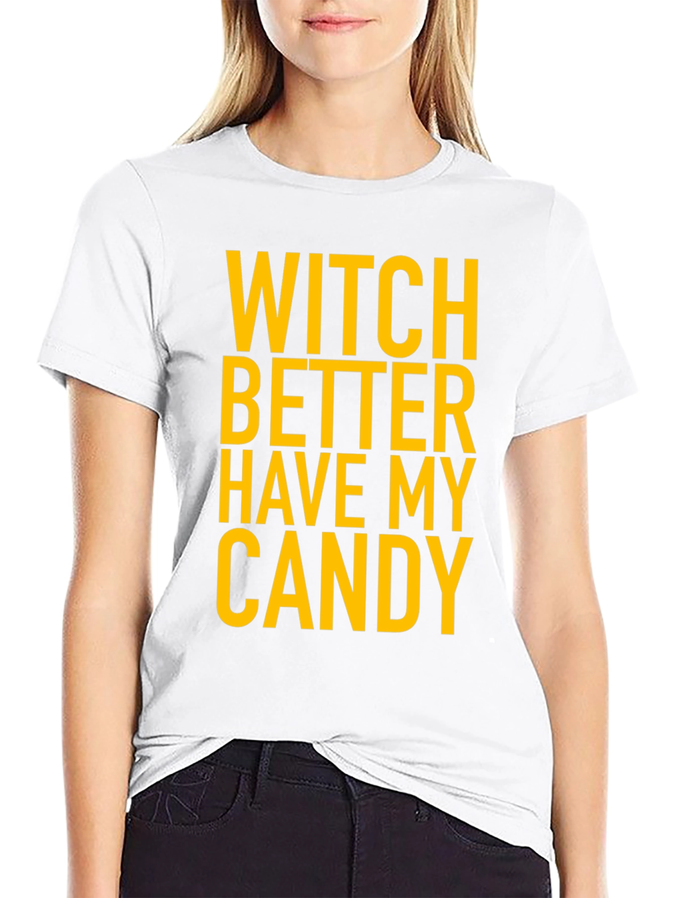Get ready for Halloween with this fun and festive black t-shirt! The bold, yellow text "Witch Better Have My Candy" makes a statement and is perfect for trick-or-treating, parties, or casual wear. Made from a comfortable-looking fabric, this tee is ideal for both men and women who love Halloween. Show off your spooky spirit with this unique and eye-catching design, and get ready for some serious candy collecting this season. This shirt is bound to be a hit!
