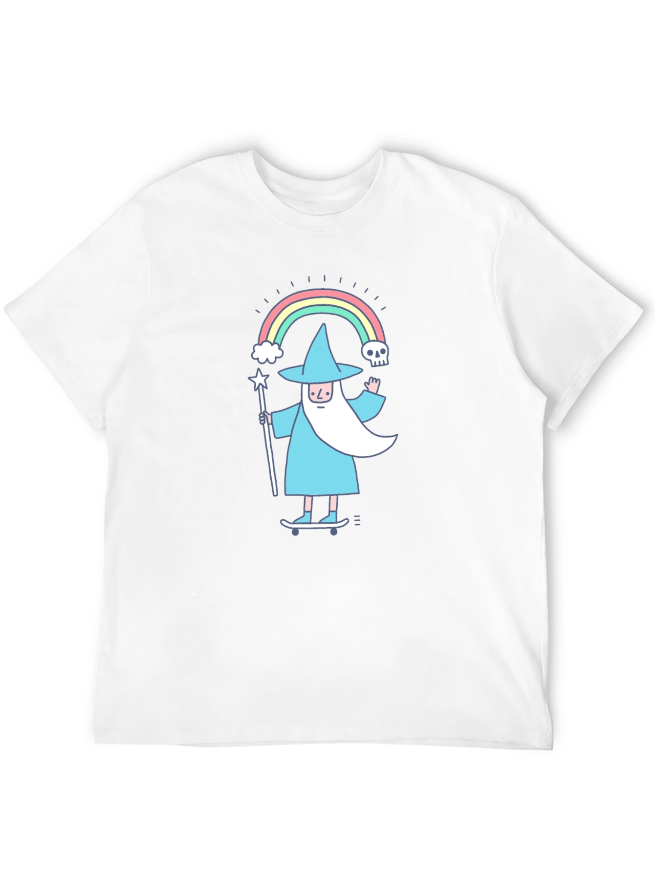 Show off your unique style with this eye-catching black graphic tee! The shirt features a whimsical design of a wizard riding a skateboard under a rainbow. The wizard is depicted in a light blue robe and hat, holding a magic wand. The playful graphic is perfect for those who love fantasy with a modern twist. Made from comfortable cotton, this tee is ideal for everyday wear. Pair it with jeans or shorts for a casual look, or dress it up with a blazer for a more elevated style. A great conversation starter and a fun addition to any wardrobe!