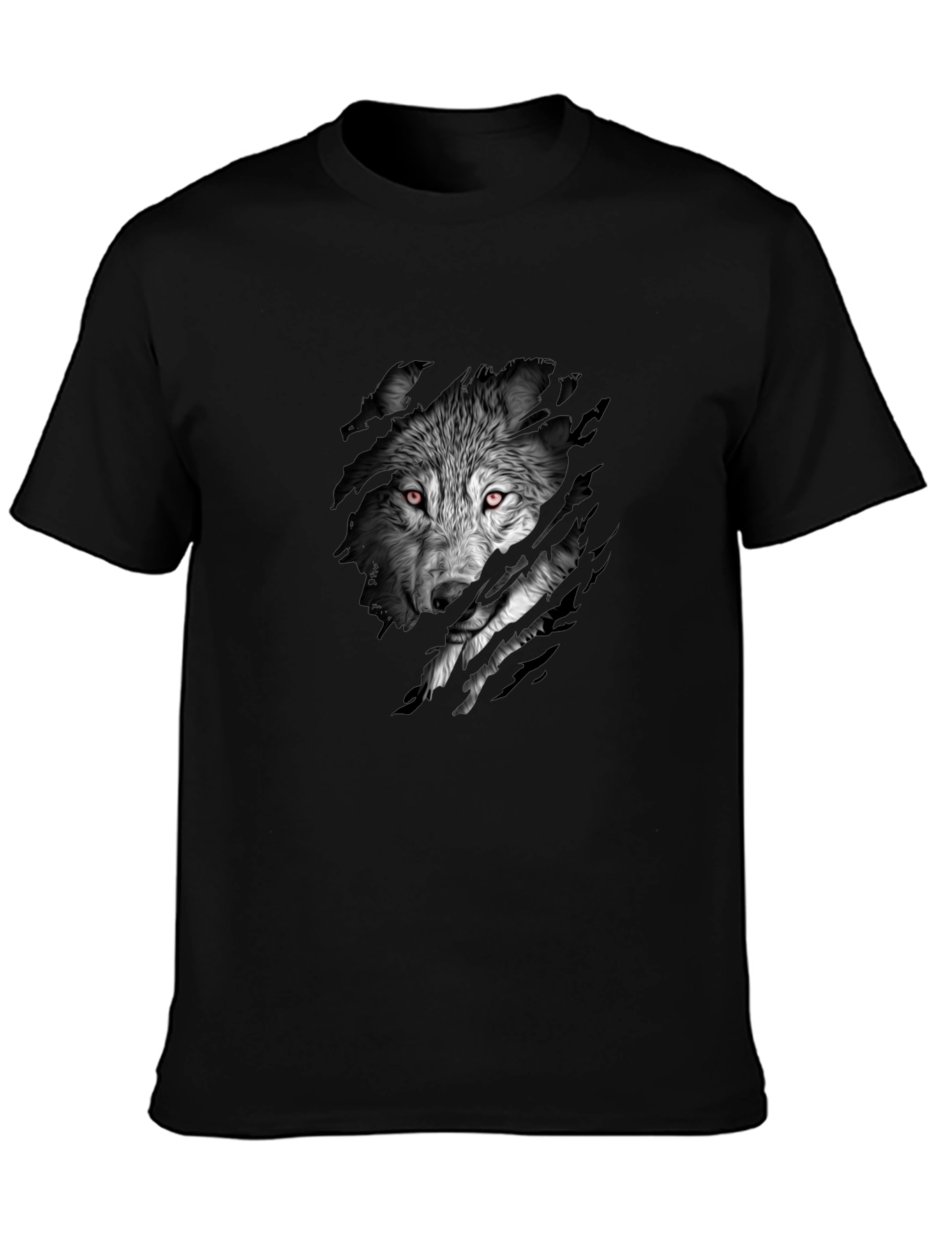 Show your wild side with this striking black t-shirt. The shirt features a captivating graphic of a wolf emerging from torn fabric, complete with intense red eyes that command attention. Made from a soft, comfortable fabric, this shirt is perfect for casual wear, concerts, or making a statement wherever you go. The bold design is sure to turn heads and express your unique personality. Pair it with jeans or shorts for an effortlessly cool look. Available in various sizes, it makes a great gift for animal lovers and those who appreciate edgy fashion.