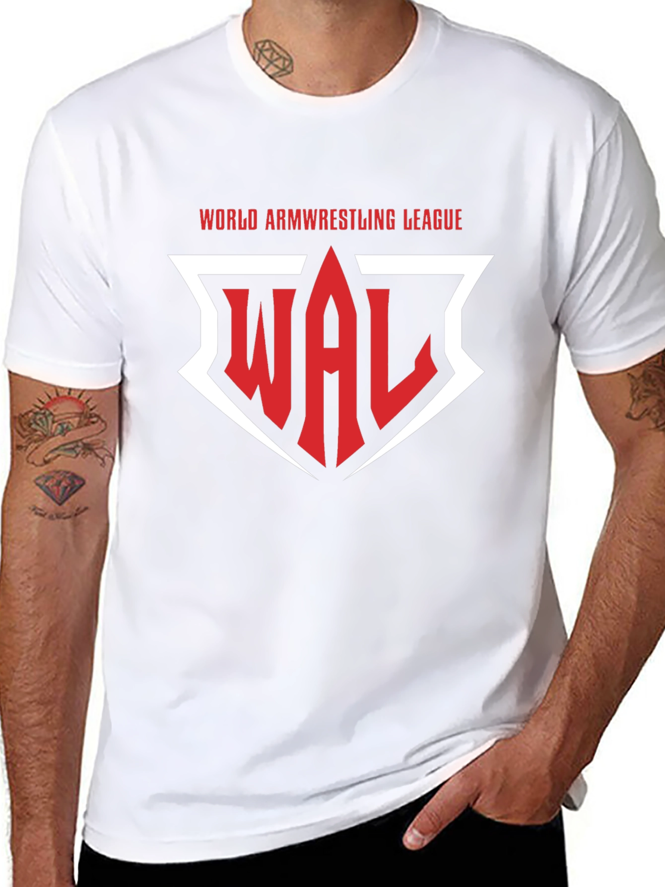 Show your support for the World Armwrestling League with this bold graphic tee. Featuring the iconic WAL logo in vibrant red against a crisp white shield, this shirt makes a statement. The classic black backdrop ensures the logo stands out, and the comfortable fit makes it ideal for everyday wear or cheering on your favorite arm wrestlers. Made with soft, breathable fabric, this t-shirt combines style and comfort seamlessly. Whether you're a dedicated fan or simply appreciate unique graphic designs, this WAL tee is a must-have addition to your wardrobe. Perfect for casual outings, gym sessions, or arm wrestling events.