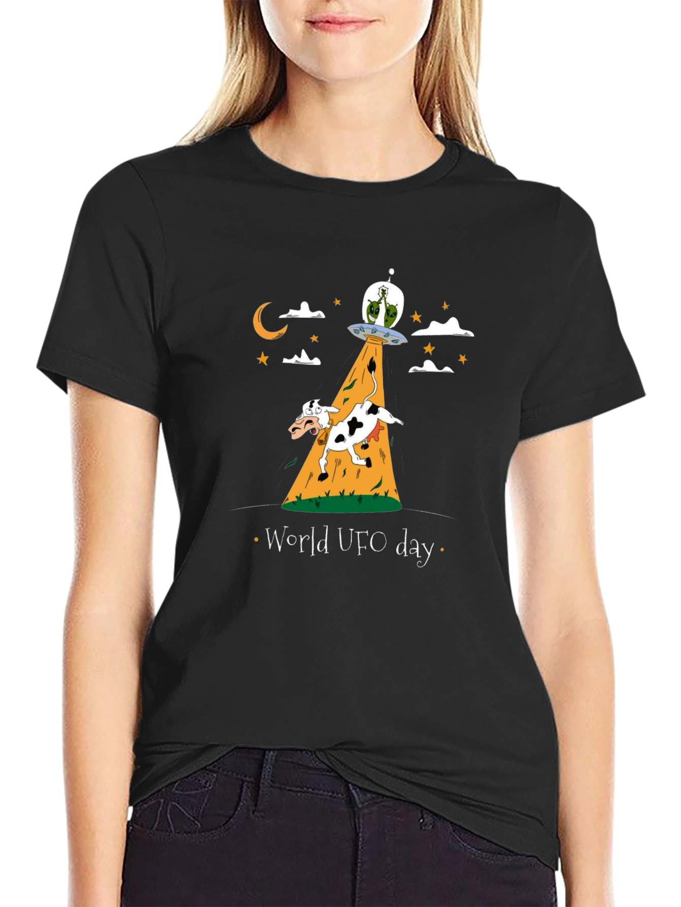 Celebrate World UFO Day with this unique graphic t-shirt! The design features a fun, cartoon-style image of a cow being abducted by a UFO, complete with a glowing beam. The shirt is black and appears to be made of a soft, comfortable cotton blend. The vibrant graphic adds a playful touch, making it a great conversation starter and a fun way to express your interest in extraterrestrial phenomena. Perfect for casual wear, UFO enthusiasts, or anyone looking to add a quirky piece to their wardrobe. Show off your love for the unexplained with this eye-catching tee!