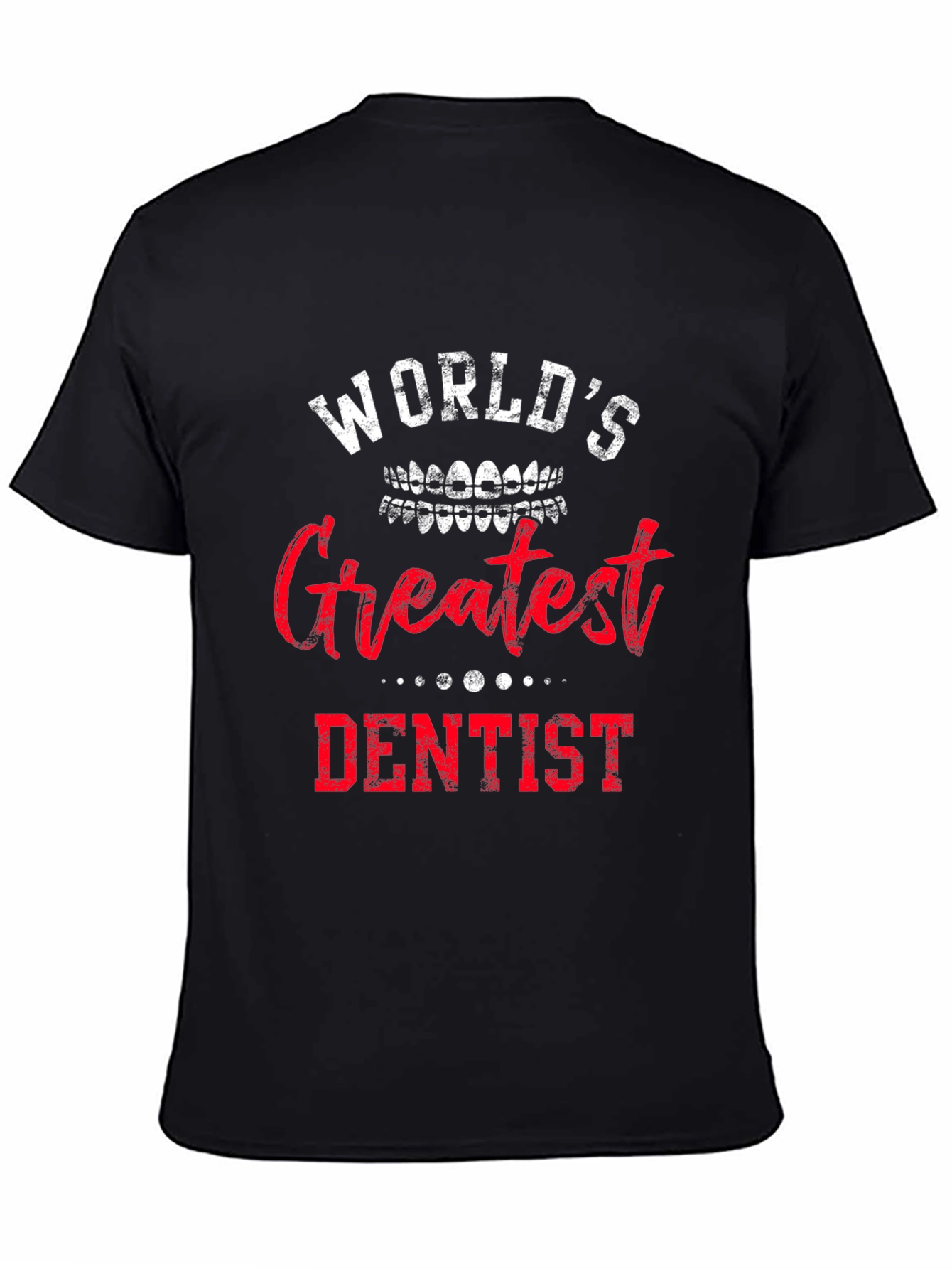 Show off your appreciation for the best dentist in the world with this unique t-shirt! Featuring a bold design with the phrase "World's Greatest Dentist" in eye-catching fonts, this black tee is sure to turn heads. A set of teeth is featured in the design. Perfect for casual wear, dental office events, or as a fun gift for your favorite dental professional. Made with comfortable materials for all-day wear, this t-shirt combines style and comfort seamlessly. Get yours today and let everyone know who the top dentist is!