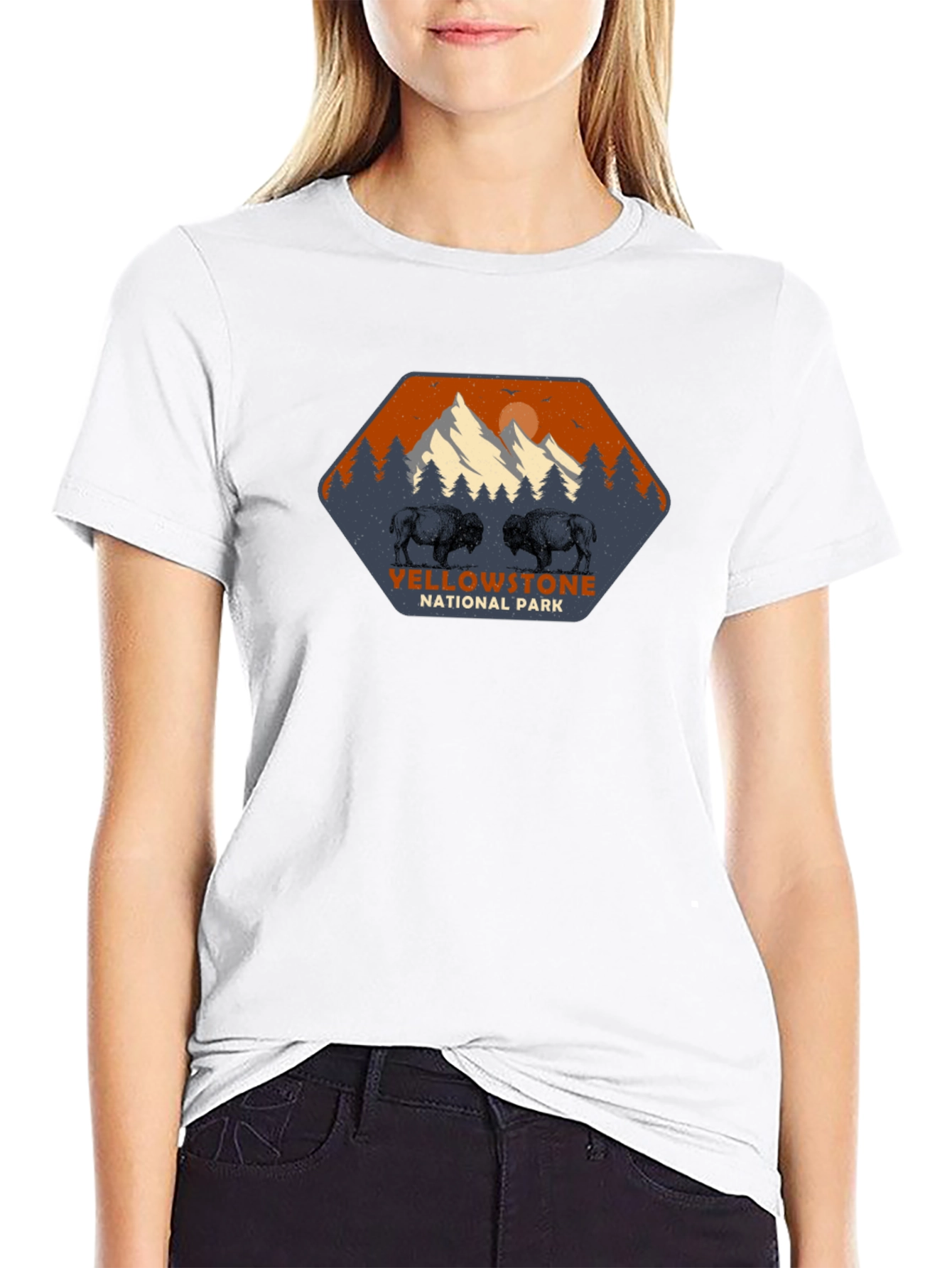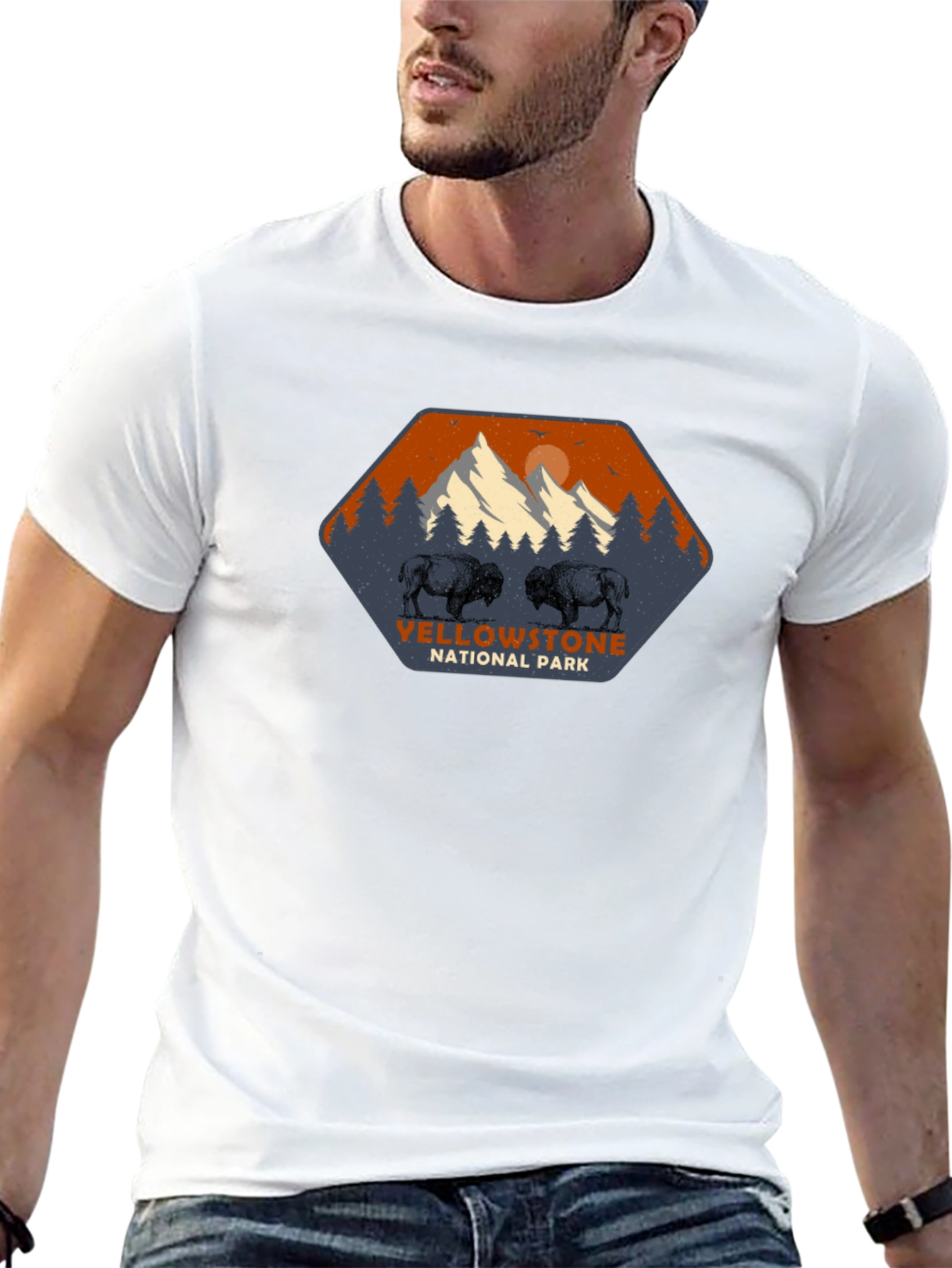 Show your love for the great outdoors with this Yellowstone National Park graphic tee! The shirt features a unique hexagon design with majestic bison, evergreen trees, and snowy mountains with a sunset. The design makes you feel like you're visiting the park yourself! The soft, breathable fabric makes it comfortable for all-day wear, whether you're hiking the trails, exploring a new city, or simply relaxing at home. This tee is a must-have for any nature enthusiast and a perfect way to celebrate one of America's most iconic national parks. Show off your passion for wildlife and the wilderness with this unique piece!