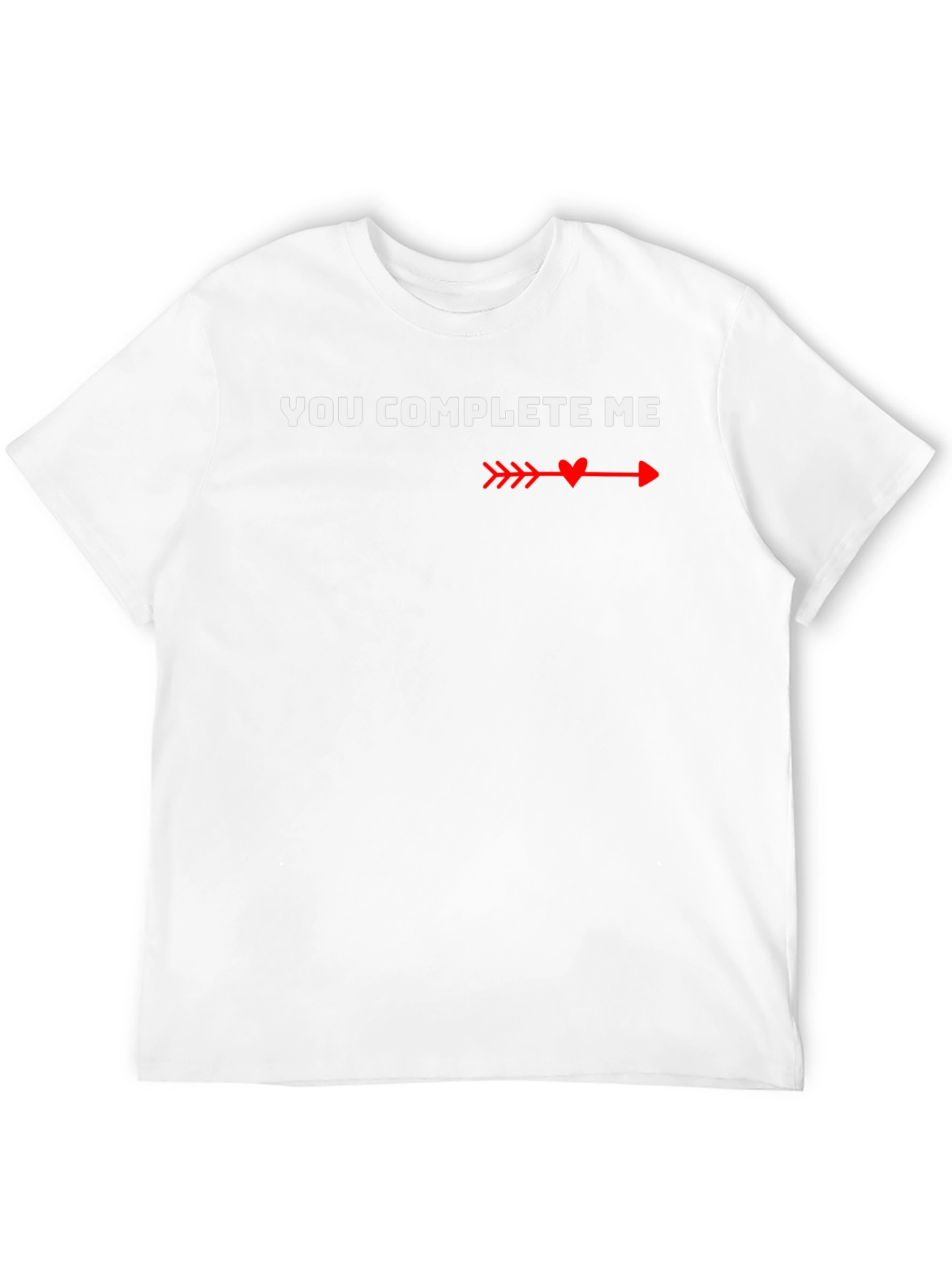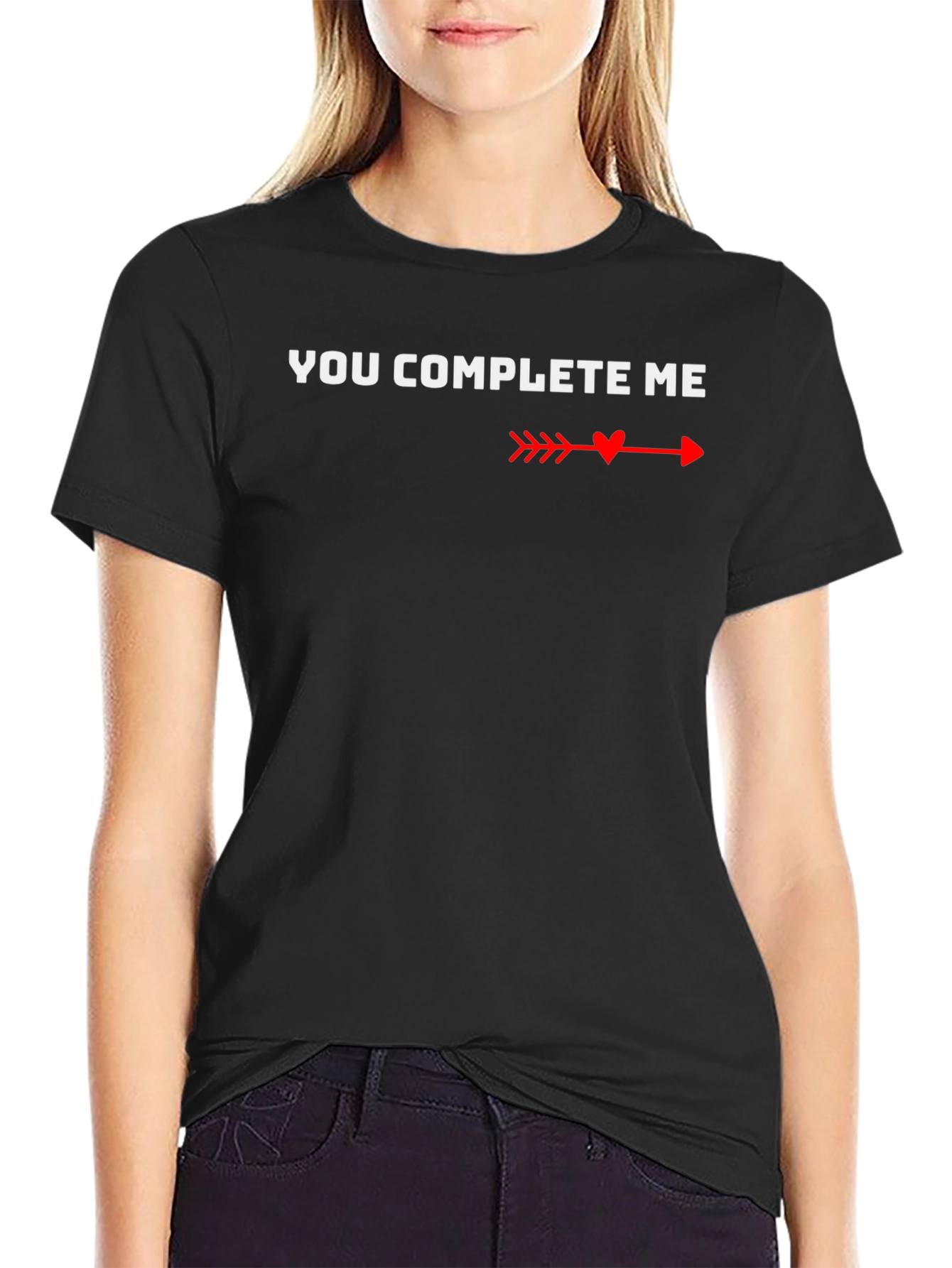 Show your affection with this black graphic tee. Features the phrase "You Complete Me" above a stylish arrow that turns into a heart design in vibrant red. Made from soft, breathable fabric for all-day comfort. Perfect for casual wear or as a thoughtful gift for someone special. Express your love in style with this unique and eye-catching t-shirt. Great for Valentine's Day, anniversaries, or just because! Let the world know who completes you with this charming and expressive tee.