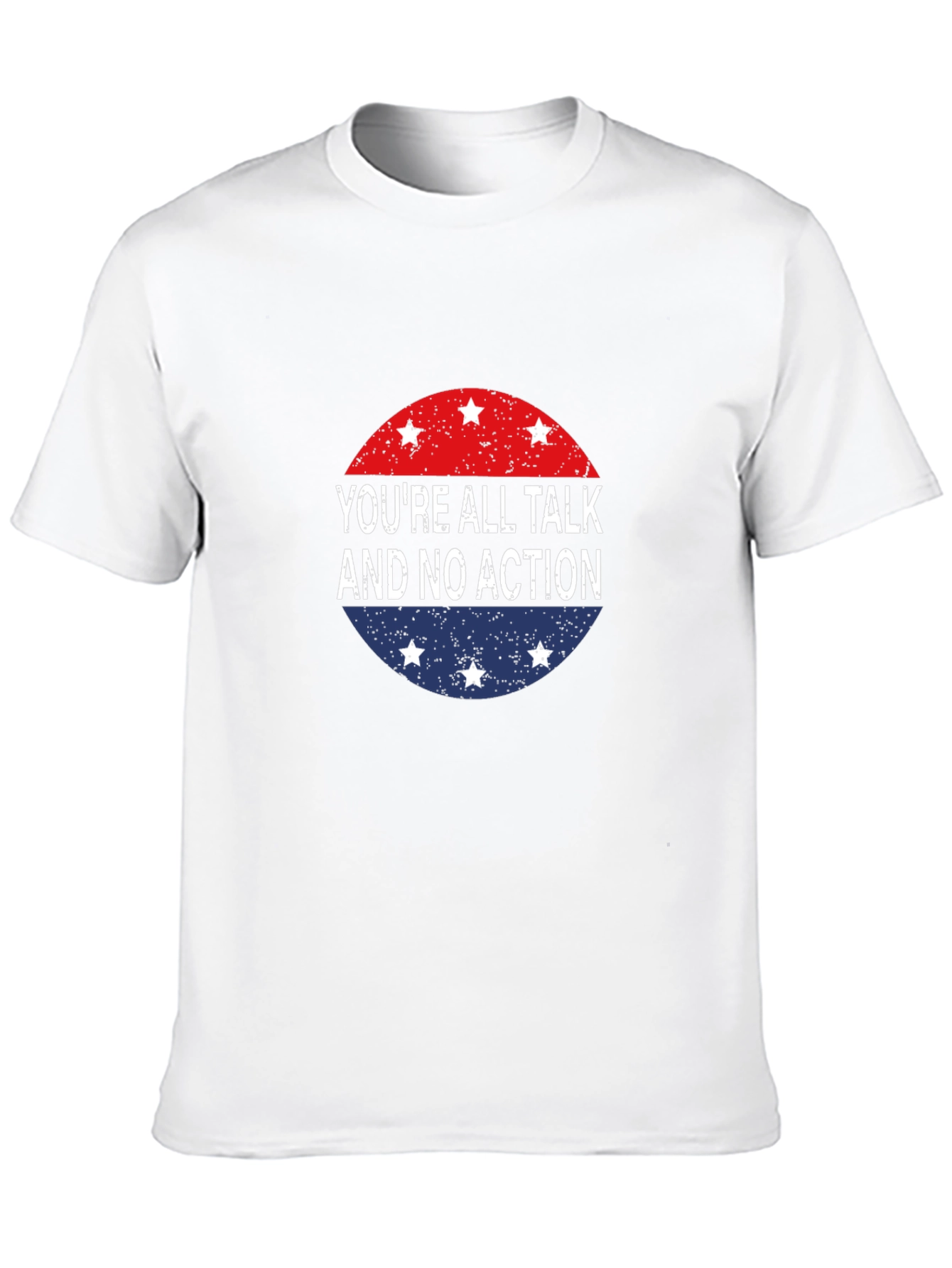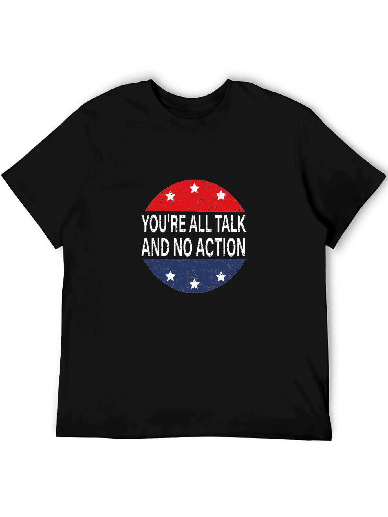 Show your attitude with this bold graphic tee! This black, short-sleeve t-shirt features a patriotic-inspired design with a red and blue circle and white stars. The weathered text reads "You're All Talk AND No Action". Made from a comfortable-looking fabric, this tee is perfect for casual wear and making a statement. Express your personality and start conversations with this unique tee.
