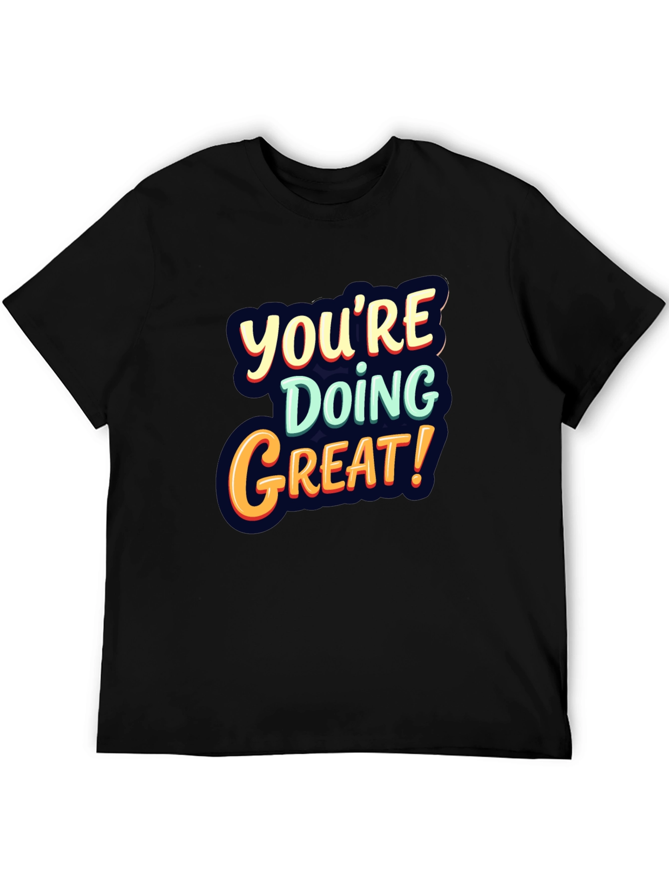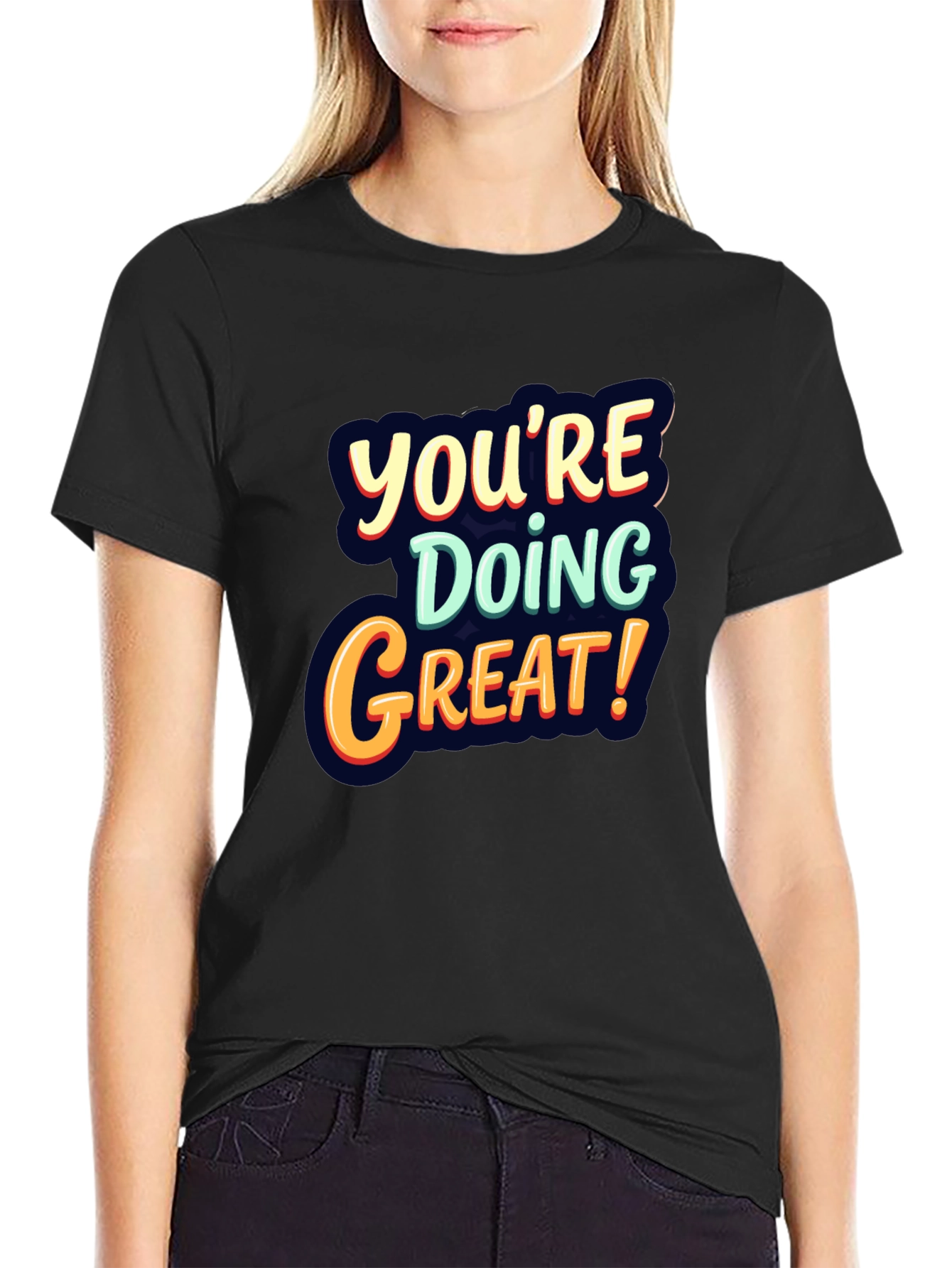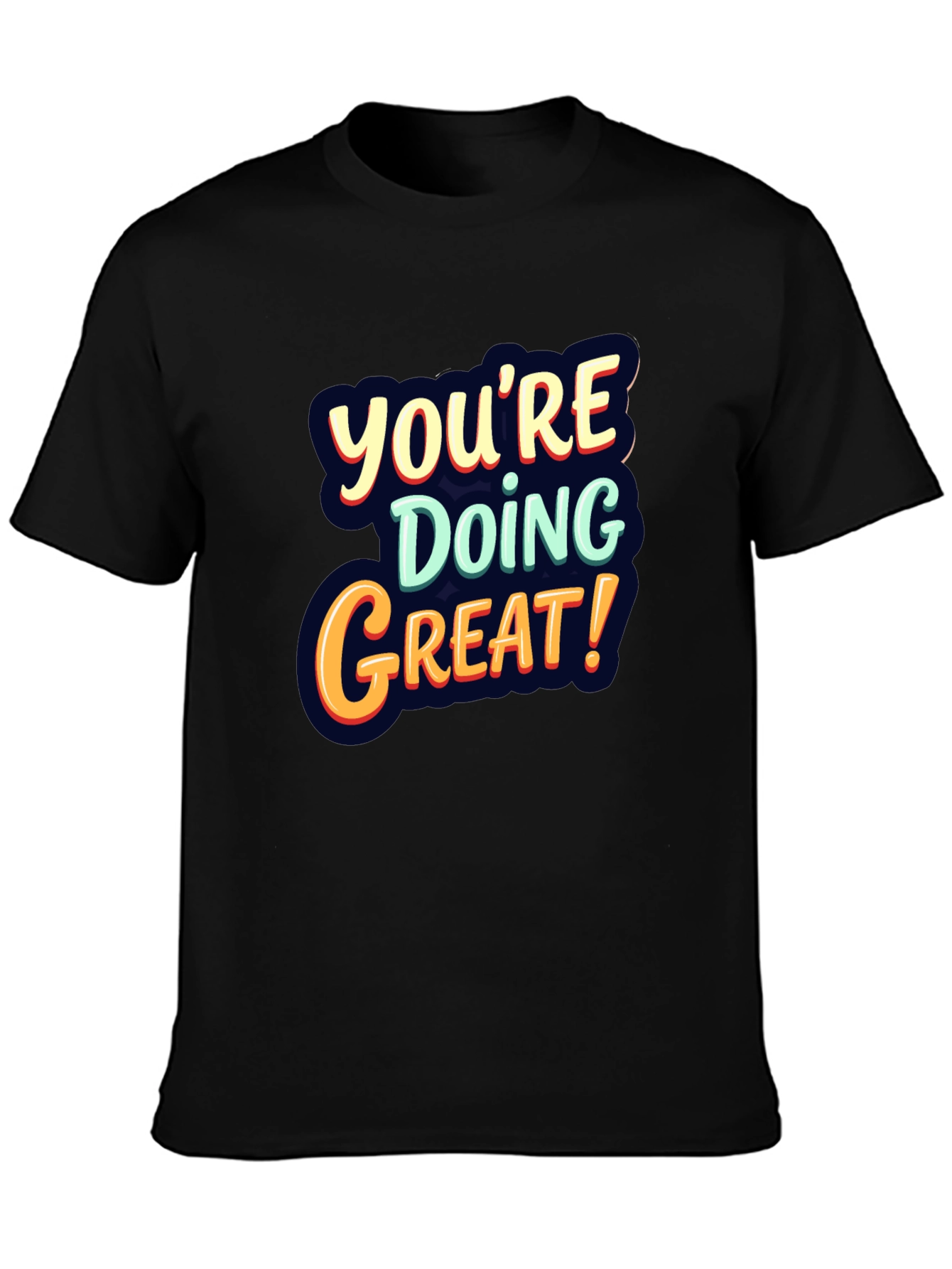 Show off your positive vibes with this stylish black t-shirt featuring a cheerful graphic print. The phrase "You're Doing Great!" is displayed in a vibrant mix of yellow, teal, and orange colors with a playful, retro-inspired font. This short-sleeved tee looks to be made from a soft, breathable cotton blend, ensuring all-day comfort. It's a great way to spread positivity and encouragement, making it perfect for casual wear, workouts, or as a thoughtful gift for someone who needs a little boost. Its classic fit and bold design make it a standout piece in any wardrobe. Pair it with jeans, shorts, or leggings for a relaxed and stylish look.
