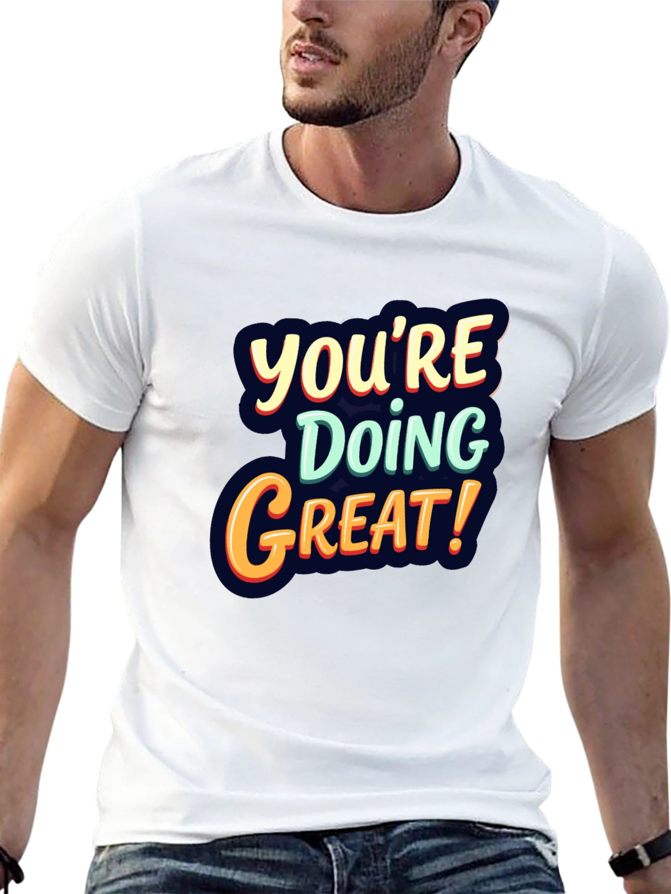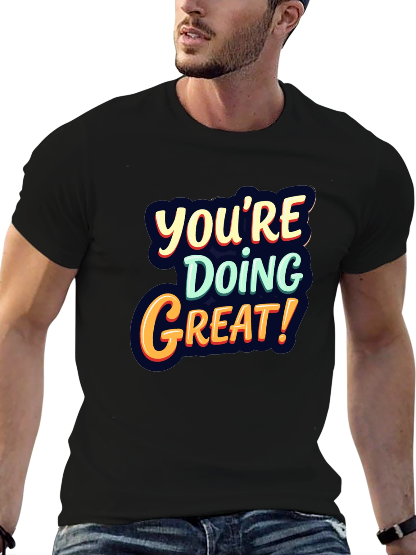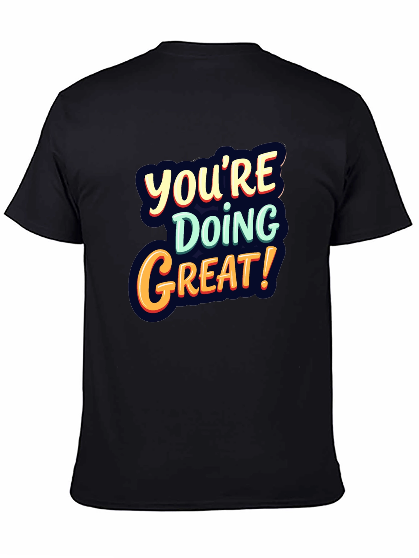 Show off your positive vibes with this stylish black t-shirt featuring a cheerful graphic print. The phrase "You're Doing Great!" is displayed in a vibrant mix of yellow, teal, and orange colors with a playful, retro-inspired font. This short-sleeved tee looks to be made from a soft, breathable cotton blend, ensuring all-day comfort. It's a great way to spread positivity and encouragement, making it perfect for casual wear, workouts, or as a thoughtful gift for someone who needs a little boost. Its classic fit and bold design make it a standout piece in any wardrobe. Pair it with jeans, shorts, or leggings for a relaxed and stylish look.